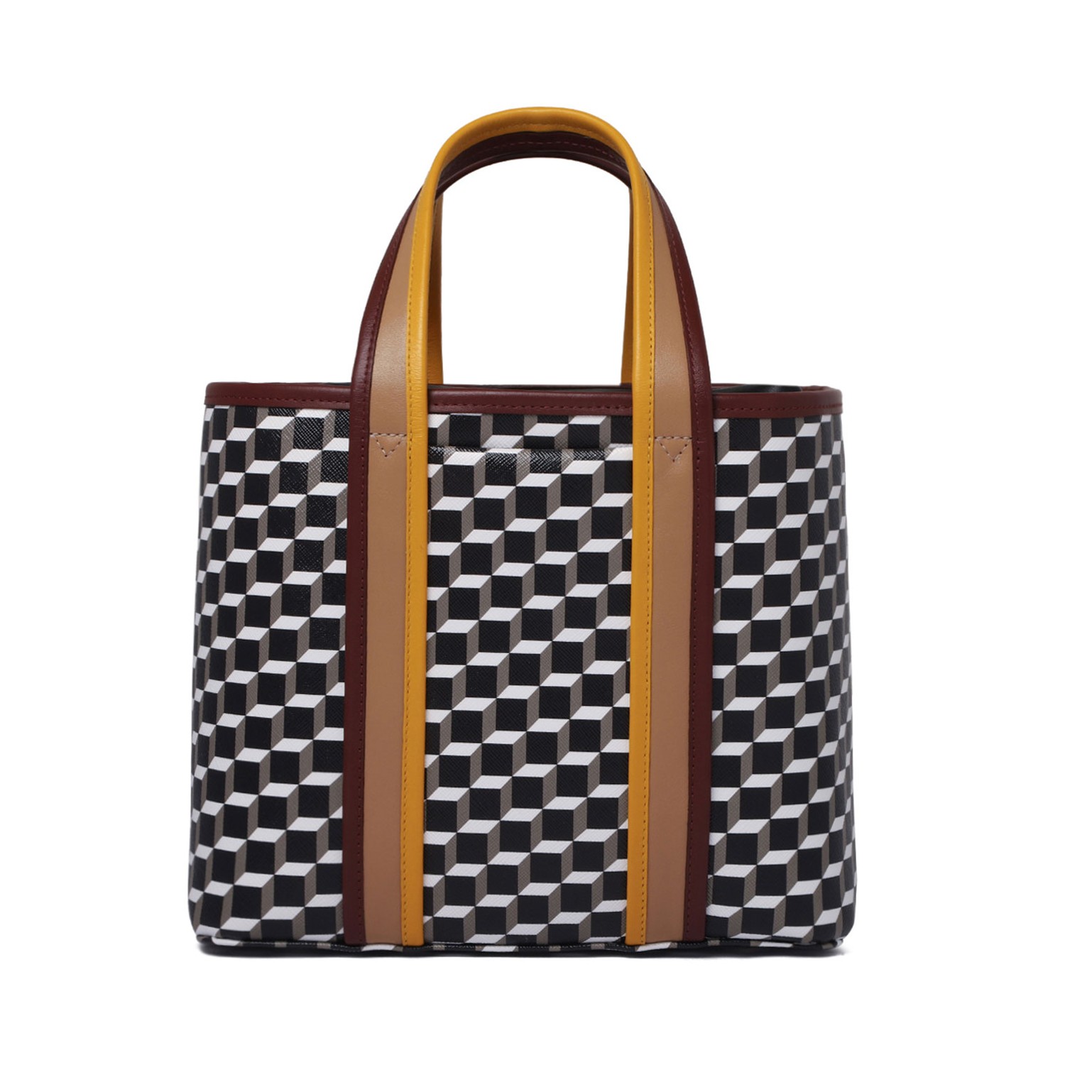 Pierre Handy Multicolour Mini Archi Bag. Multicolour coated canvas printed with the signature Cube Perspective pattern bag. Grained calfskin leather straps, detachable interior leather pouch with drawstring. Small front pouch, detachable and adjustable shoulder strap.
