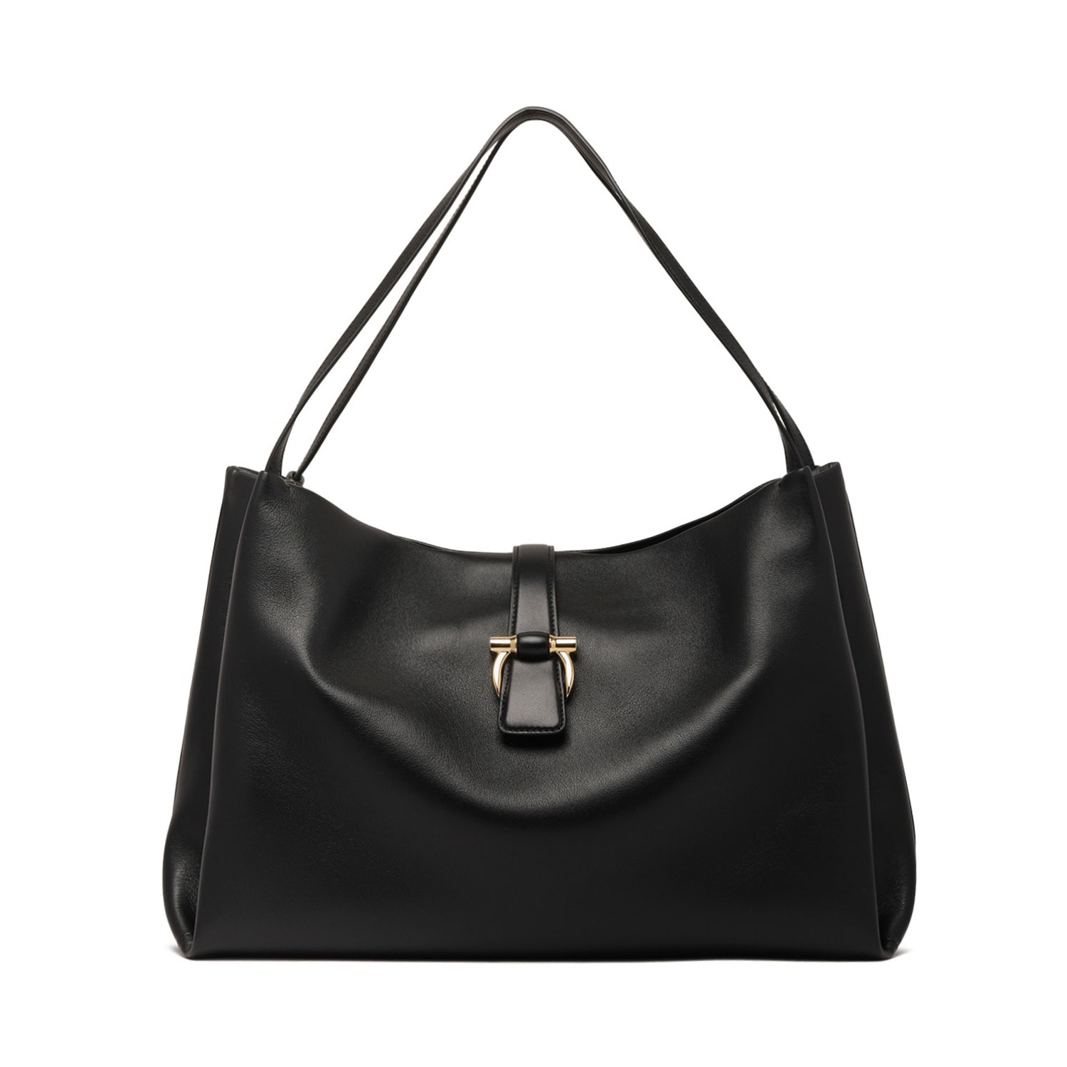 Ferragamo Black Medium Gancini Tote Bag. Black leather medium tote bag with Gancini buckle, debossed internal logo, gold-tone hardware. Magnetic fastening, two flat shoulder straps, internal zip-fastening pocket.