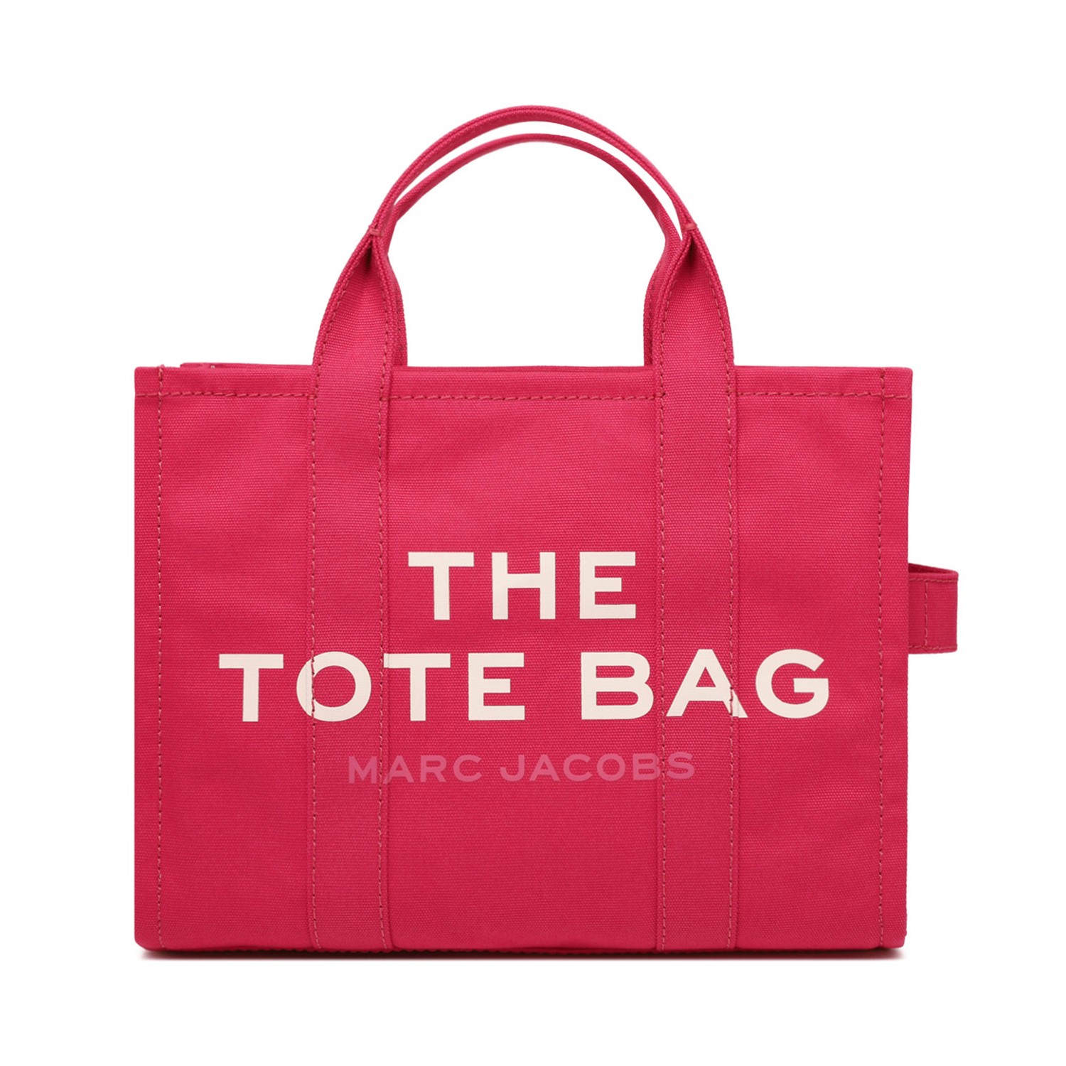 Marc Jacobs Raspberry Pink The Medium Tote Bag. Rasperry pink canvas medium tote bag with logo print to the front, robust top handles, sturdy top zipper, slip pocket, card slot, removable cross strap.