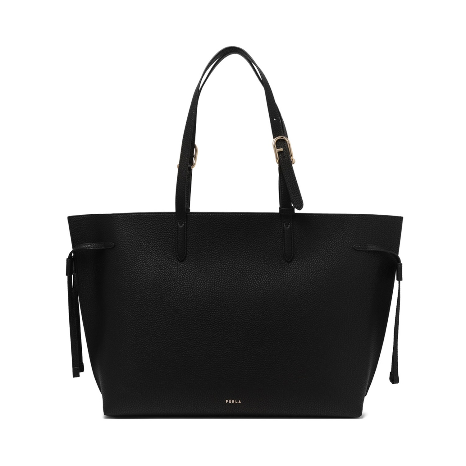 Furla Black Ava Shopping Bag L. Black Ava tote bag is crafted from elegant calfskin with a reversible finish and a contrasting colorblock interior. This generously sized model features a spacious interior to hold all your essentials. The double long handles, adjustable via the Arco logo hardware, allow it to be worn as a top handle or over the shoulder.