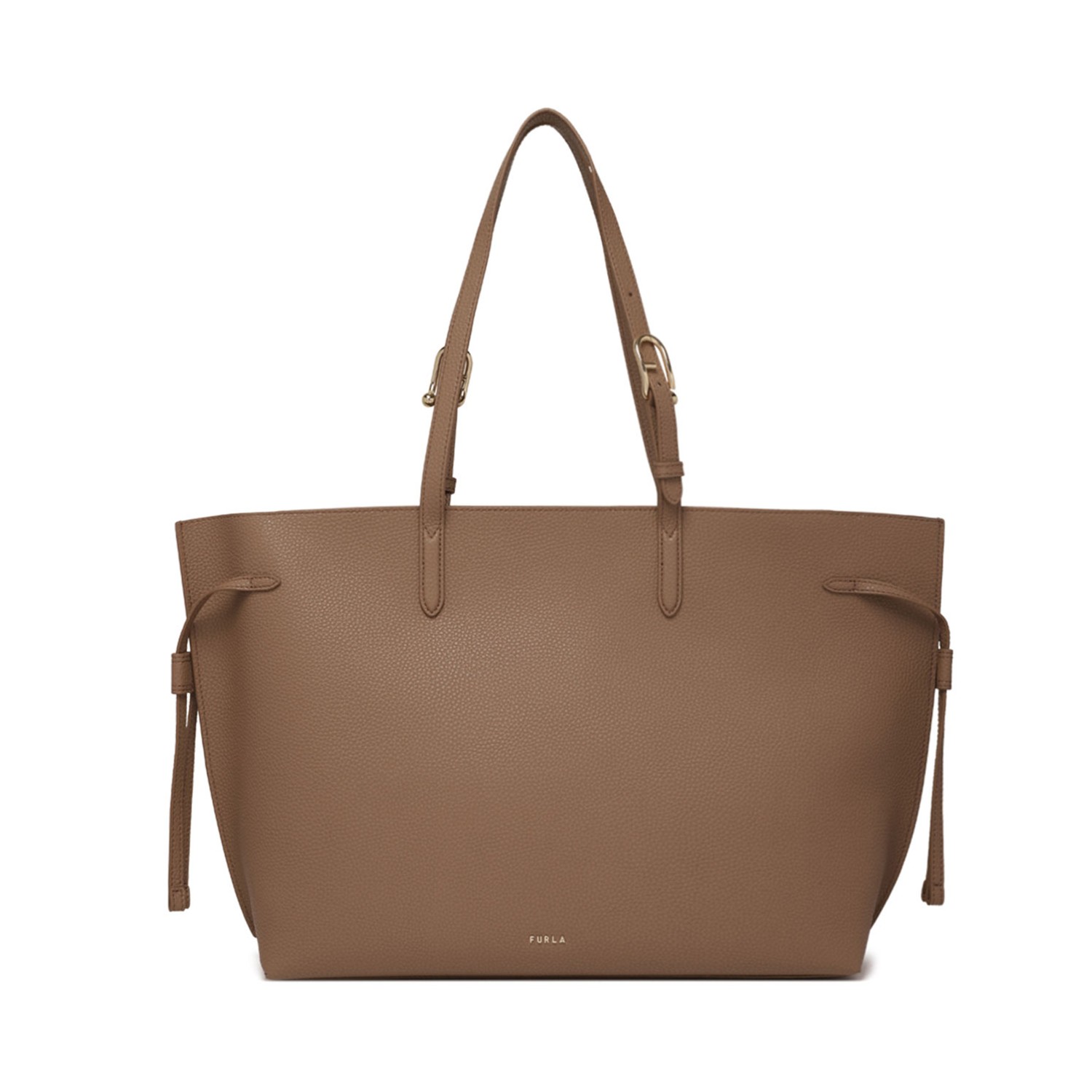 Furla Toffee and Black Ava Shopping Bag L. Toffee and black Ava tote bag is crafted from elegant calfskin with a reversible finish and a contrasting colorblock interior. This generously sized model features a spacious interior to hold all your essentials. The double long handles, adjustable via the Arco logo hardware, allow it to be worn as a top handle or over the shoulder.