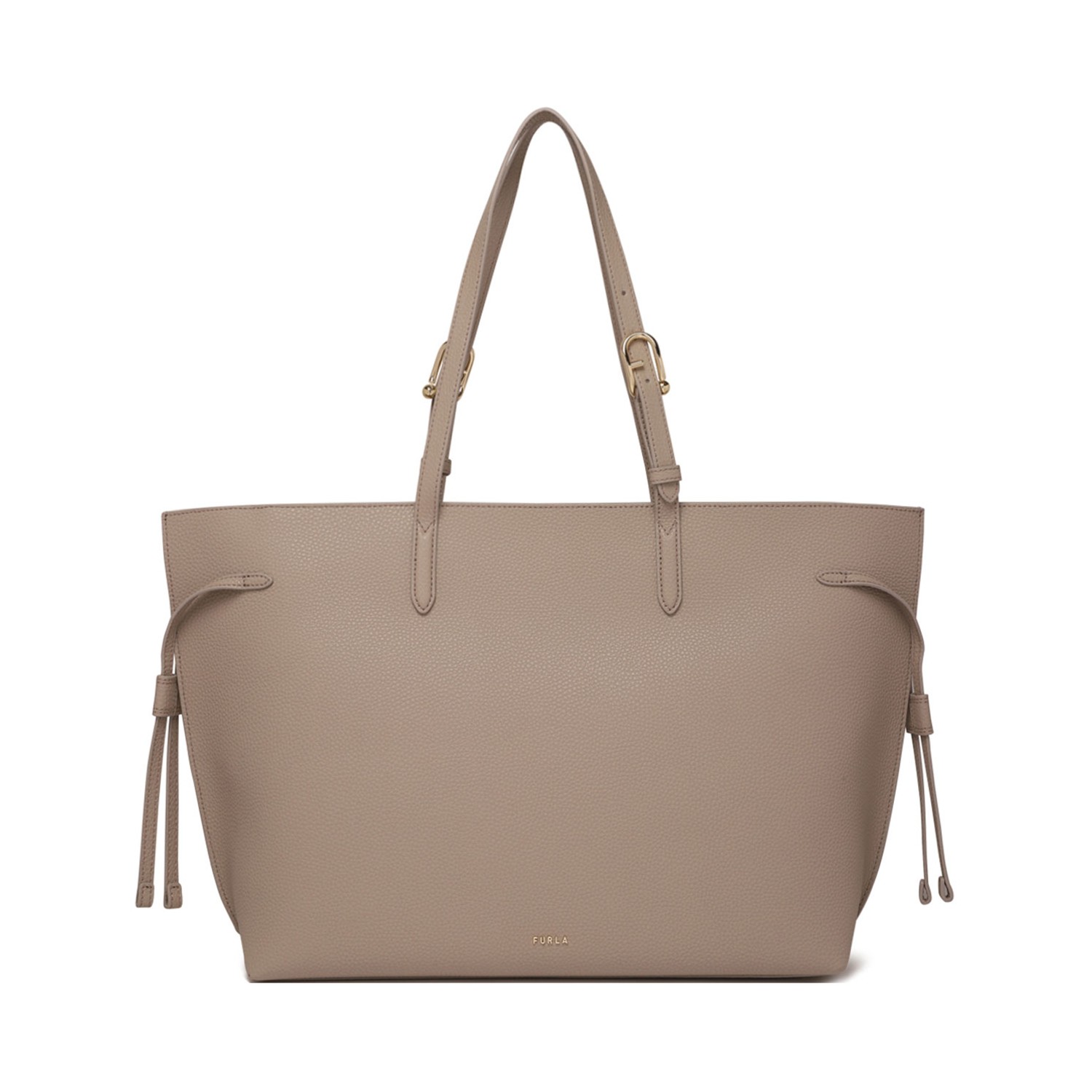 Furla Linen and Urban Grey Ava Shopping Bag L. Linen and urban grey Ava tote bag is crafted from elegant calfskin with a reversible finish and a contrasting colorblock interior. This generously sized model features a spacious interior to hold all your essentials. The double long handles, adjustable via the Arco logo hardware, allow it to be worn as a top handle or over the shoulder.