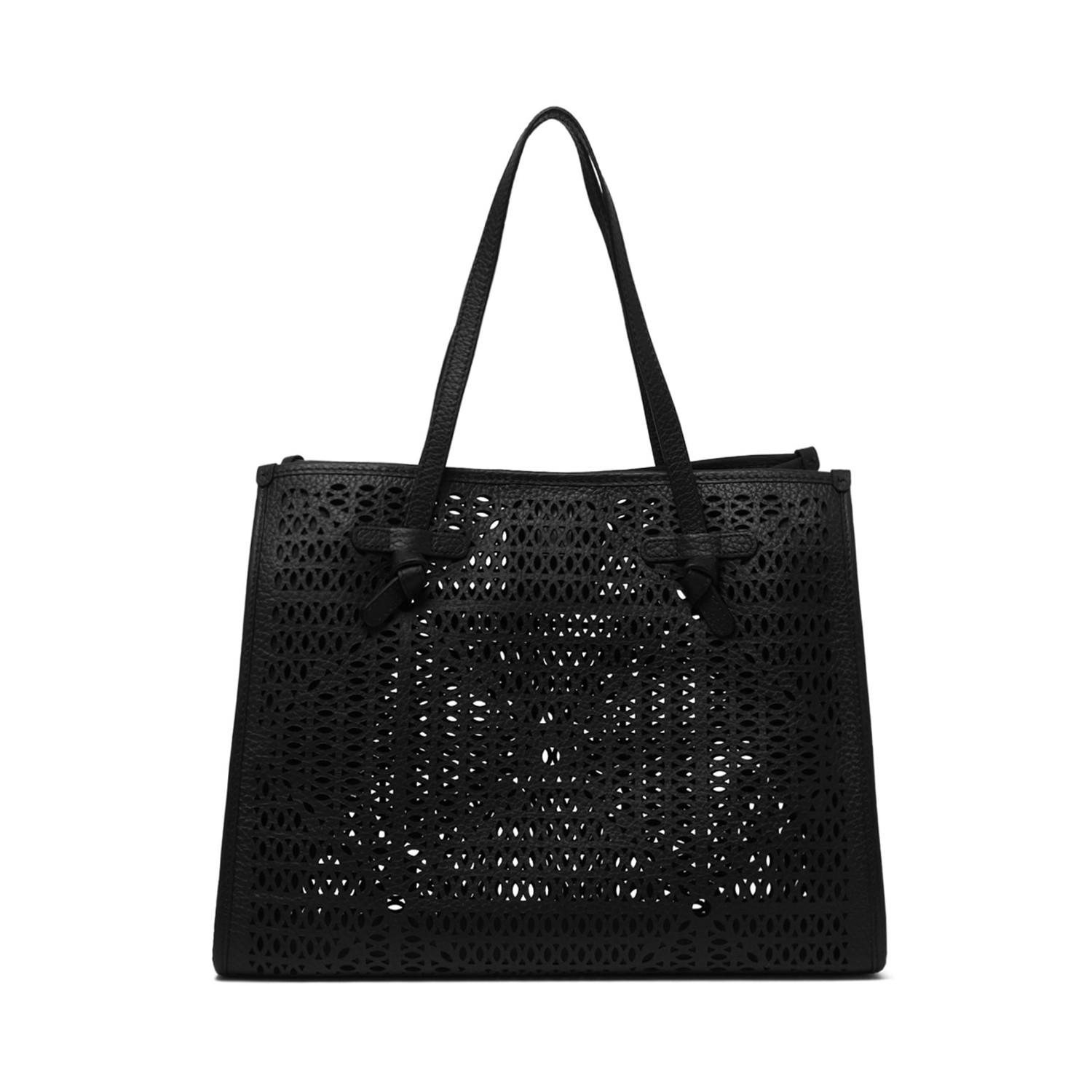 Marcella Black Double Bubble Leather Tote Bag. Crafted from double bubble leather, the Marcella tote bag by Gianni Chiarini Firenze is embellished with a perforated design that gives it a unique and recognizable look. Perfect for summer days in the city or on vacation, it features leather handles and a convenient magnetic closure, ideal for everyday use. The internal leather pouch adds practicality and versatility.