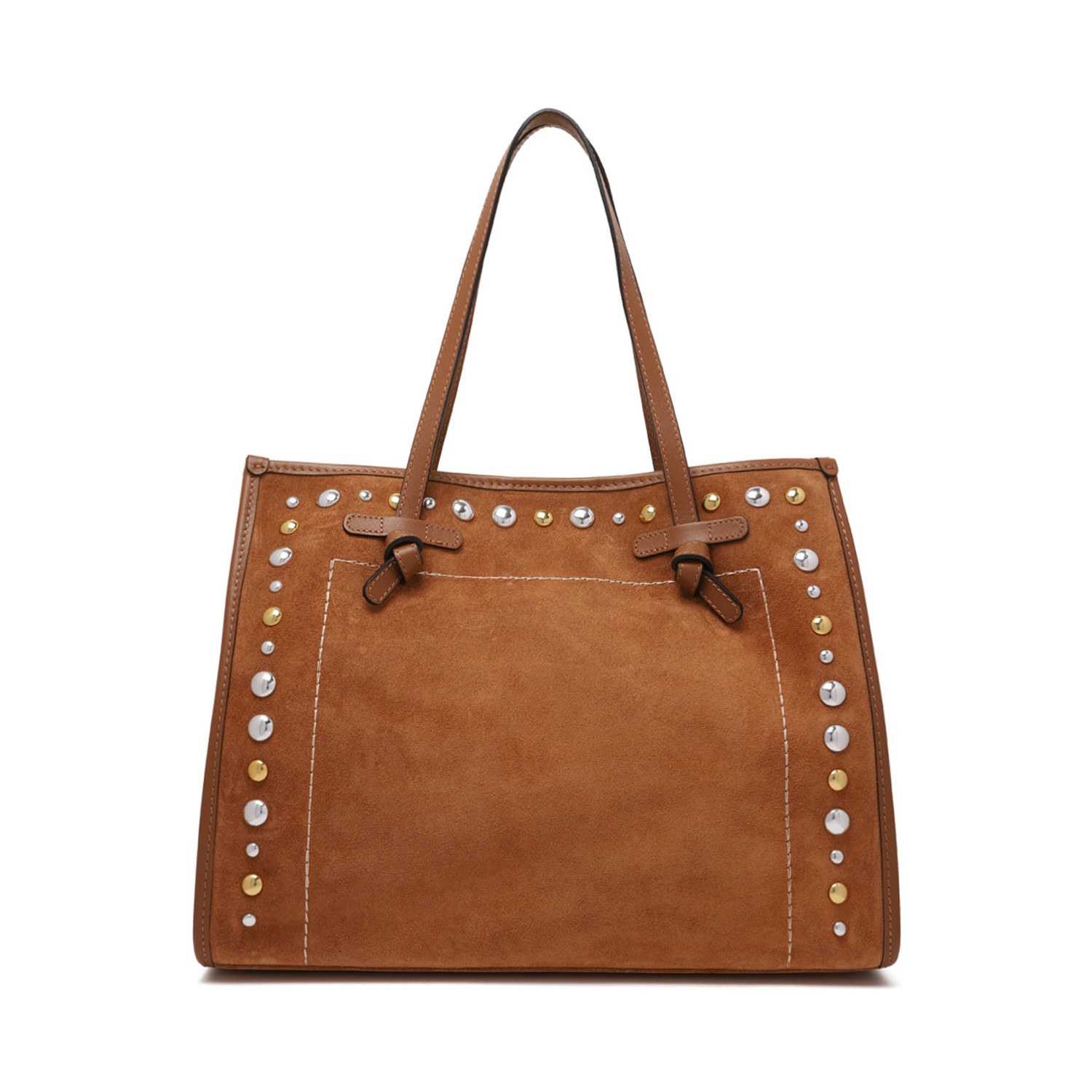Marcella Caramel Suede Tote Bag With Metal Studs. Caramel suede tote bag features contrasting stitching and metal studs that give it a Western feel. The minimalist design is enhanced by leather trim. Featuring leather handles and a convenient magnetic closure, it's ideal for everyday use. The internal zip pocket makes it extremely practical and versatile.