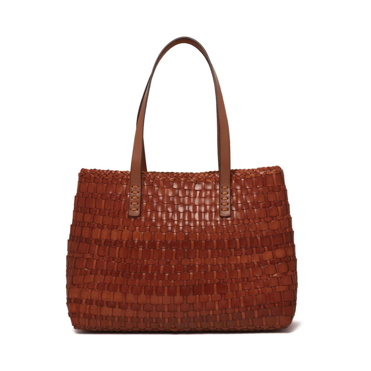 Dragon Diffusion Tan Salvage Tote Bag. The Salvage offers a unique aesthetic with its irregular, scale-like weave, making it a standout piece for any wardrobe. This shoulder bag is crafted for convenience and style, featuring an inner lining for added durability and a magnetic button closure to secure your belongings.