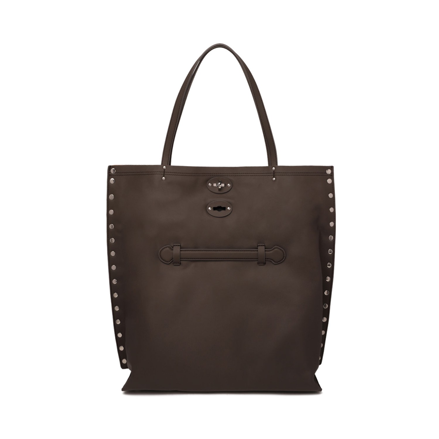Zanellato Dark Brown Leather Tote Bag. Dark brown tote bag with a soft yet structured silhouette and contemporary character. Bag crafted in smooth leather with a refined matte finish. Featuring long shoulder handles, iconic Zanellato Postina-style turn-lock closure, decorative stud detailing along the sides, front strap detail and a spacious interior, designed for elegant everyday use with a distinctive, modern edge.