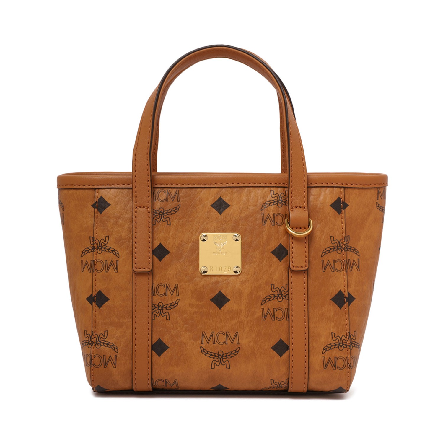 MCM Cognac Toni Top-Zip Shopper in Visetos. Cognac shopper bag with detachable, adjustable leather strap, leather top handles, MCM logo plate. Rear exterior pocket, top-zip closure, interior pocket and card slots. Natural nappa leather, all over Visetos monogram canvas and 24k gold-plated metal hardware.