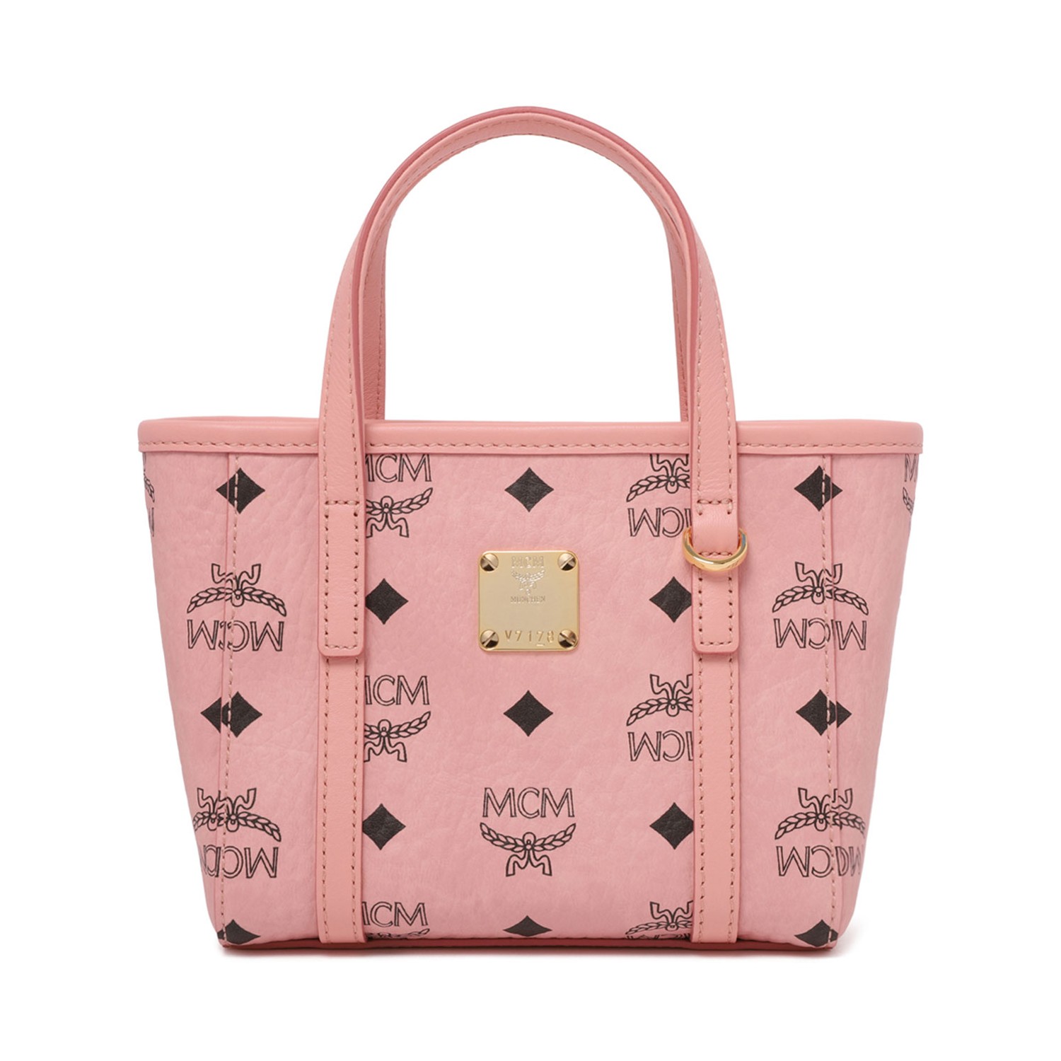 MCM Soft Pink Toni Top-Zip Shopper in Visetos. Soft pink shopper bag with detachable, adjustable leather strap, leather top handles, MCM logo plate. Rear exterior pocket, top-zip closure, interior pocket and card slots. Natural nappa leather, all over Visetos monogram canvas and 24k gold-plated metal hardware.