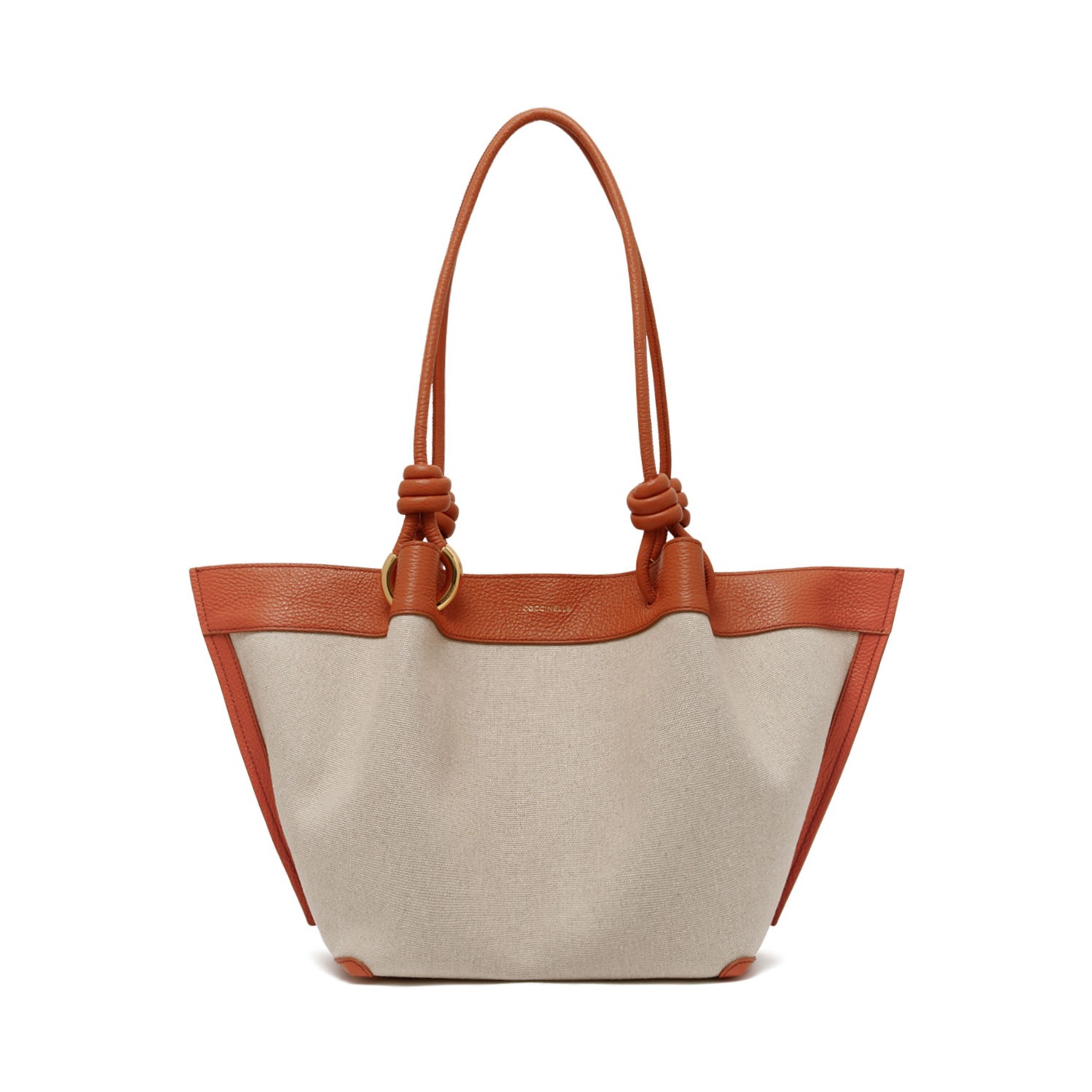 Coccinelle Natural and Crab Canvas Tote Bag. Natural tote bag with a soft, contemporary silhouette. Bag crafted in durable canvas with smooth crab grained leather trims for an elegant contrast. Featuring double top handles with knot detailing and gold-tone ring accents for a refined signature touch. Designed with a spacious interior and open-top construction, offering practicality and understated sophistication for everyday use.