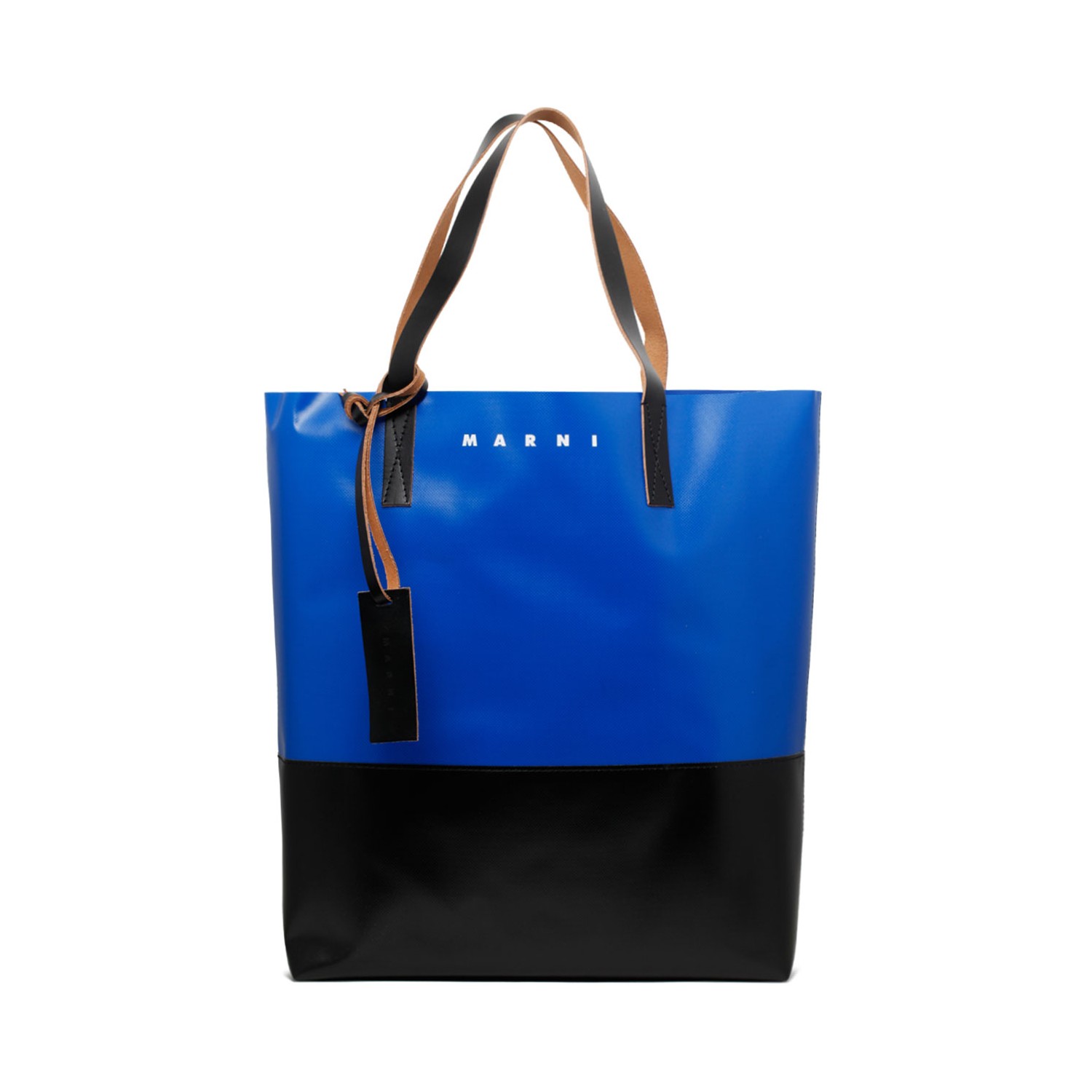 Marni Open Vertical Shopping Bag. Handles and leather tag with embossed Marni logo. Printed Marni logo. Crafted in blu, black with brown details colors.