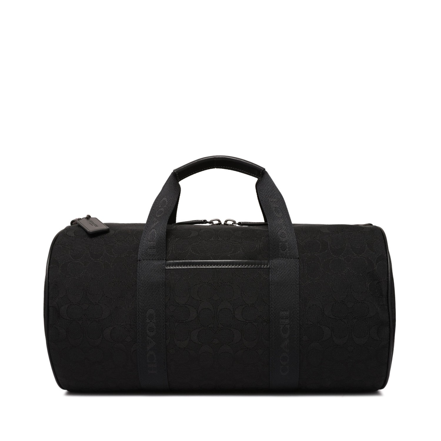 Coach Black Theo Duffel Bag In Signature Jacquard. Black Theo duffel bag crafted from refined leather and our signature lightweight jacquard, this sports bag features a roomy interior with multifunction pockets, a convenient exterior pocket and a detachable shoulder strap for hands-free carrying.