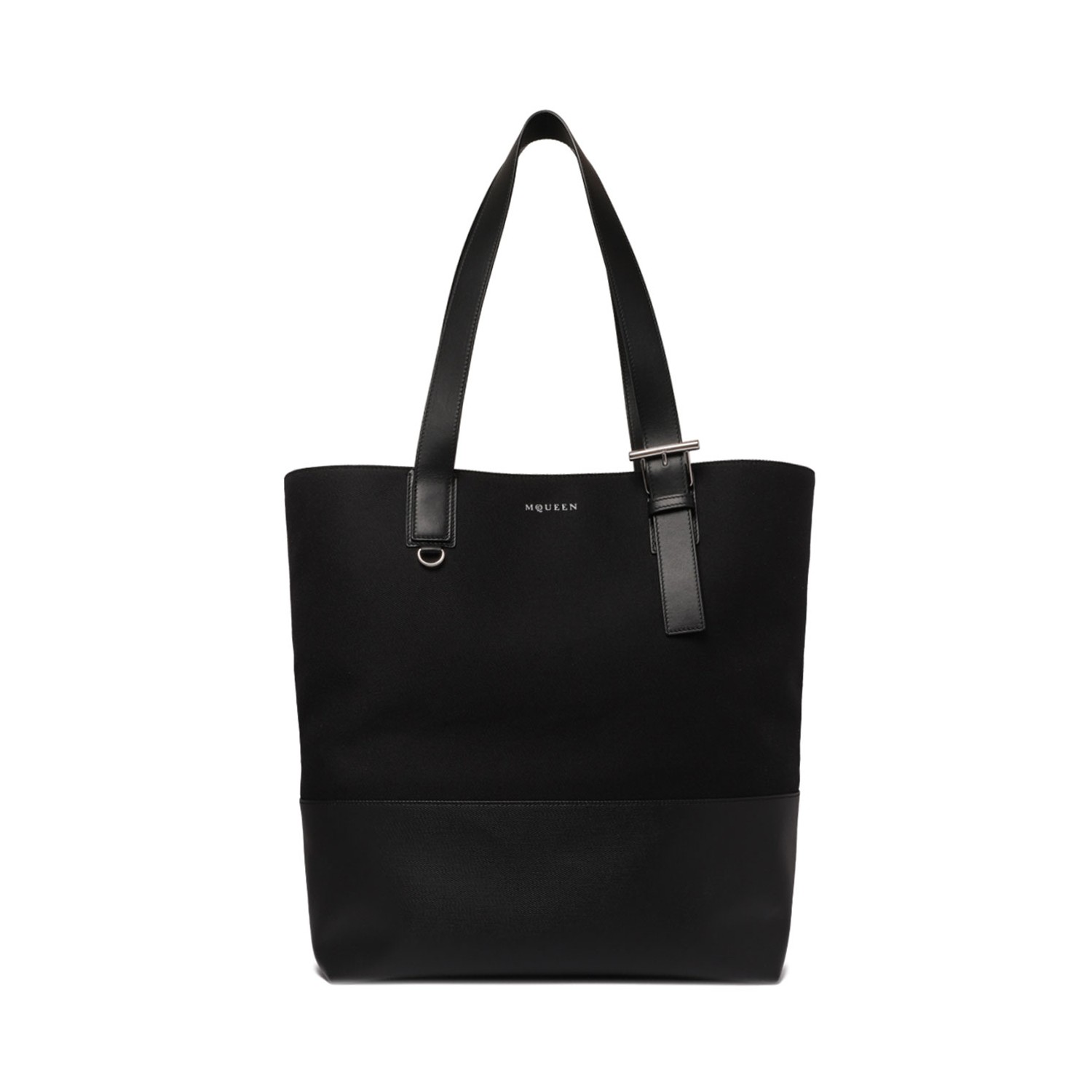 Alexander McQueen Black T-Bar Shopper. The T-Bar shopper bag crafted from black drill canvas with a coated bottom. Statement T-Bar buckle in silver metal engraved with the McQueen logo. The bag can be carried on the shoulder using the leather handles.