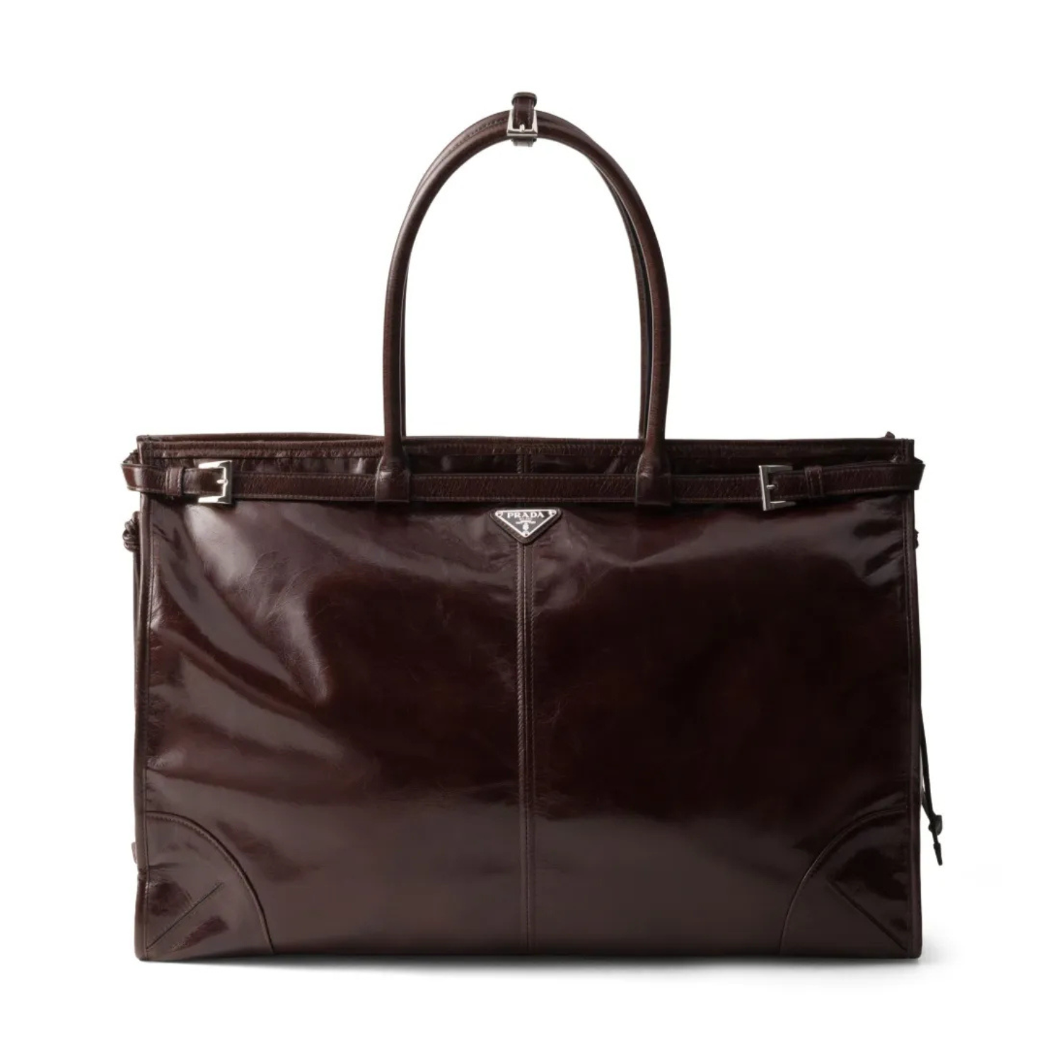Prada Brown Tote Bag With Logo. Brown nappa leather tote bag with glossy finish, enamel triangle with logo, two round handles, front bellows pocket. Top zip closure, single compartment, internal zip pocket, silver-colored details.