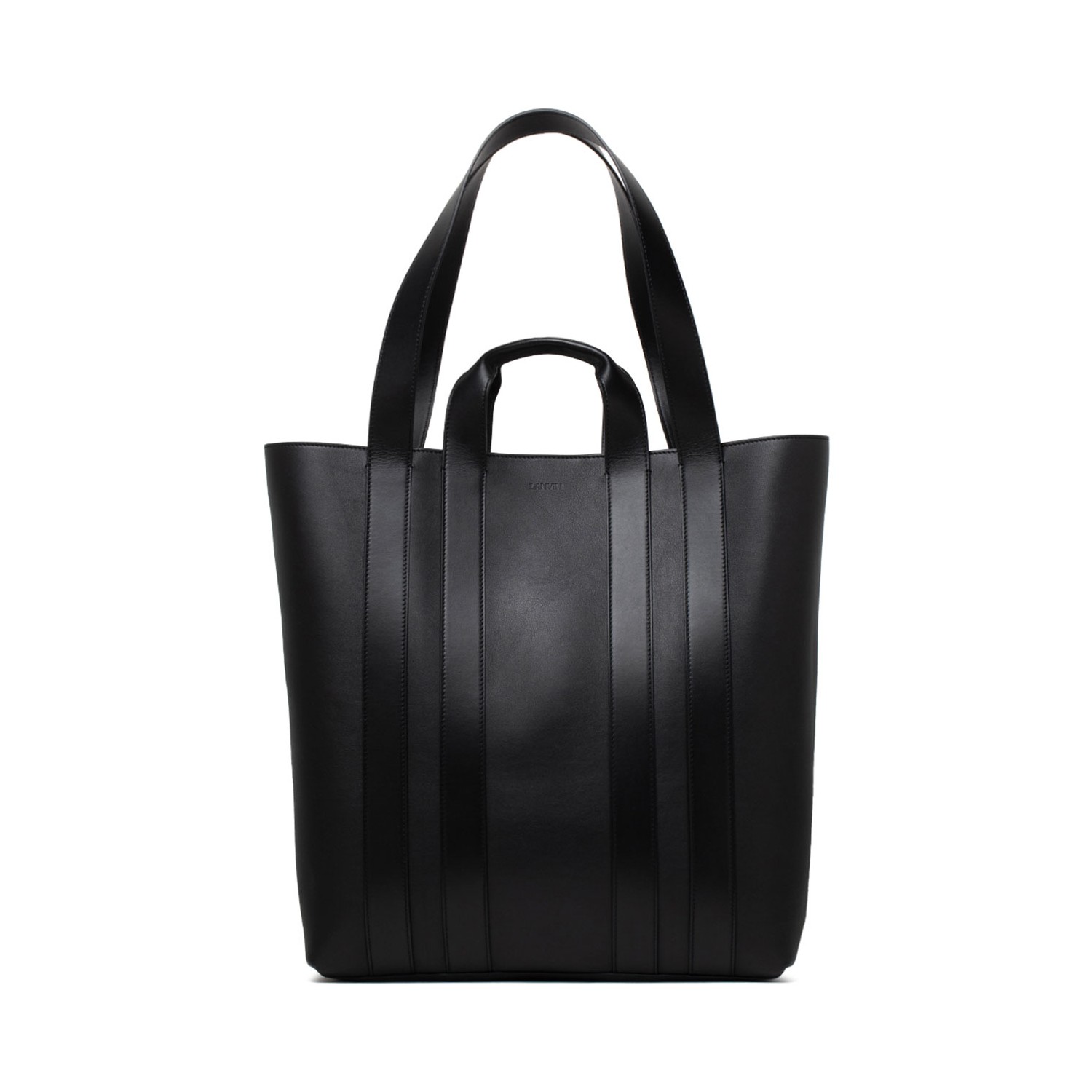 Lanvin Black Ballade North South Tote Bag. Black calf leather tote bag, two top handles, two flat shoulder straps, removable pouch, debossed logo tot he front, main compartment.