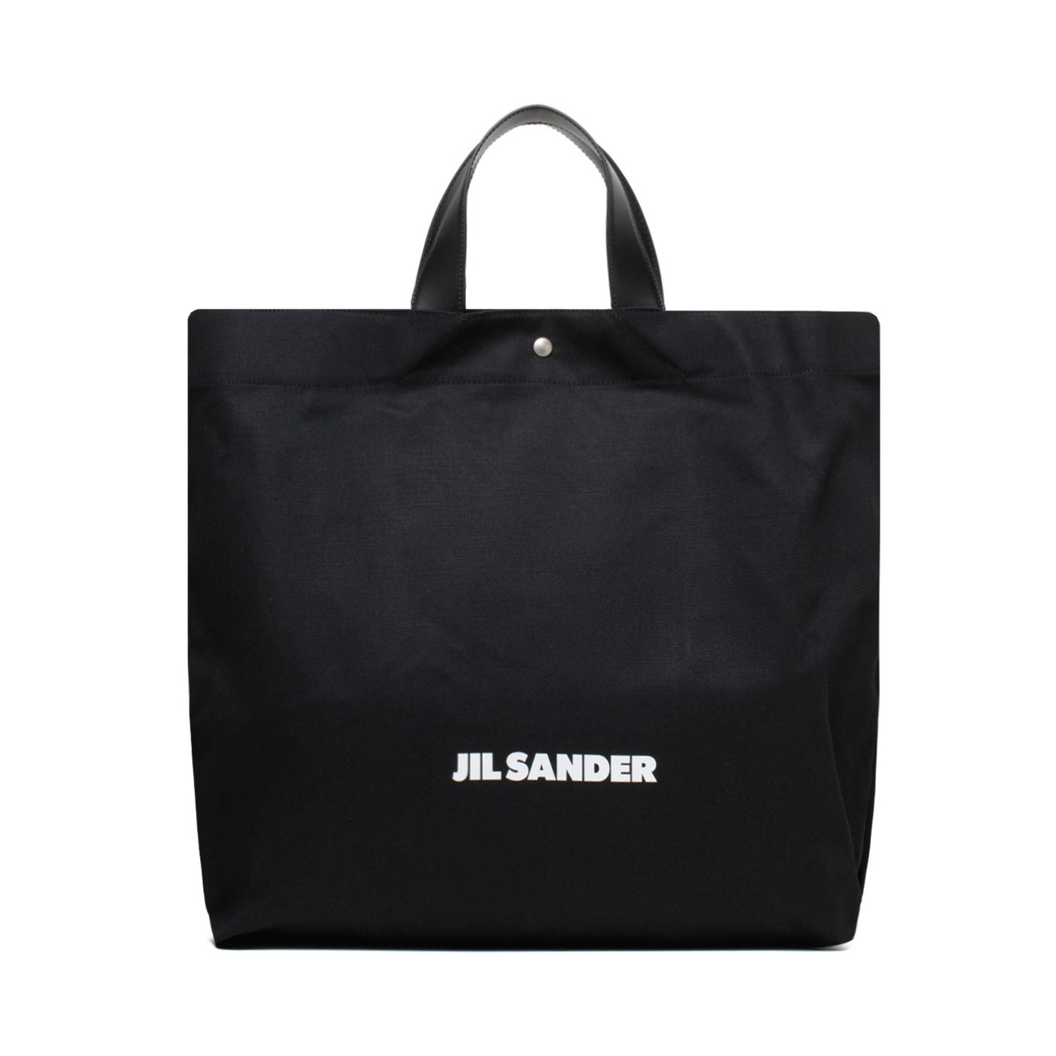 Jil Sander Flat Shopper Medium crafted in linen and cotton with leather handles. Printed Jil Sander logo on front.