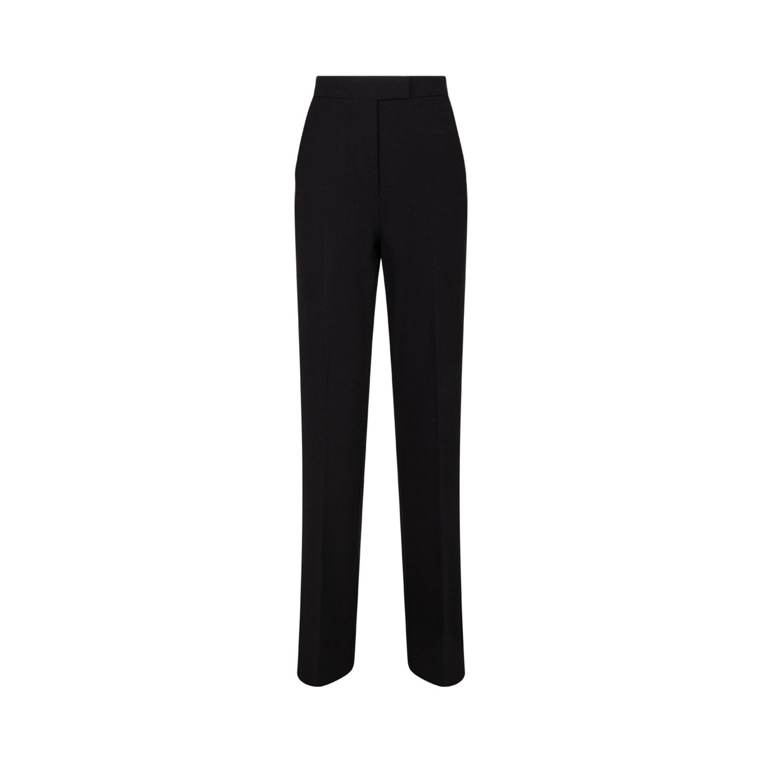 Max Mara Black Norcia Trousers. Black straight-fit trousers made of soft compact viscose jersey. The construction features a slightly high waist, an ironed crease on the leg and French pockets on the sides. Closure with a wide waistband, zip fly and hook.