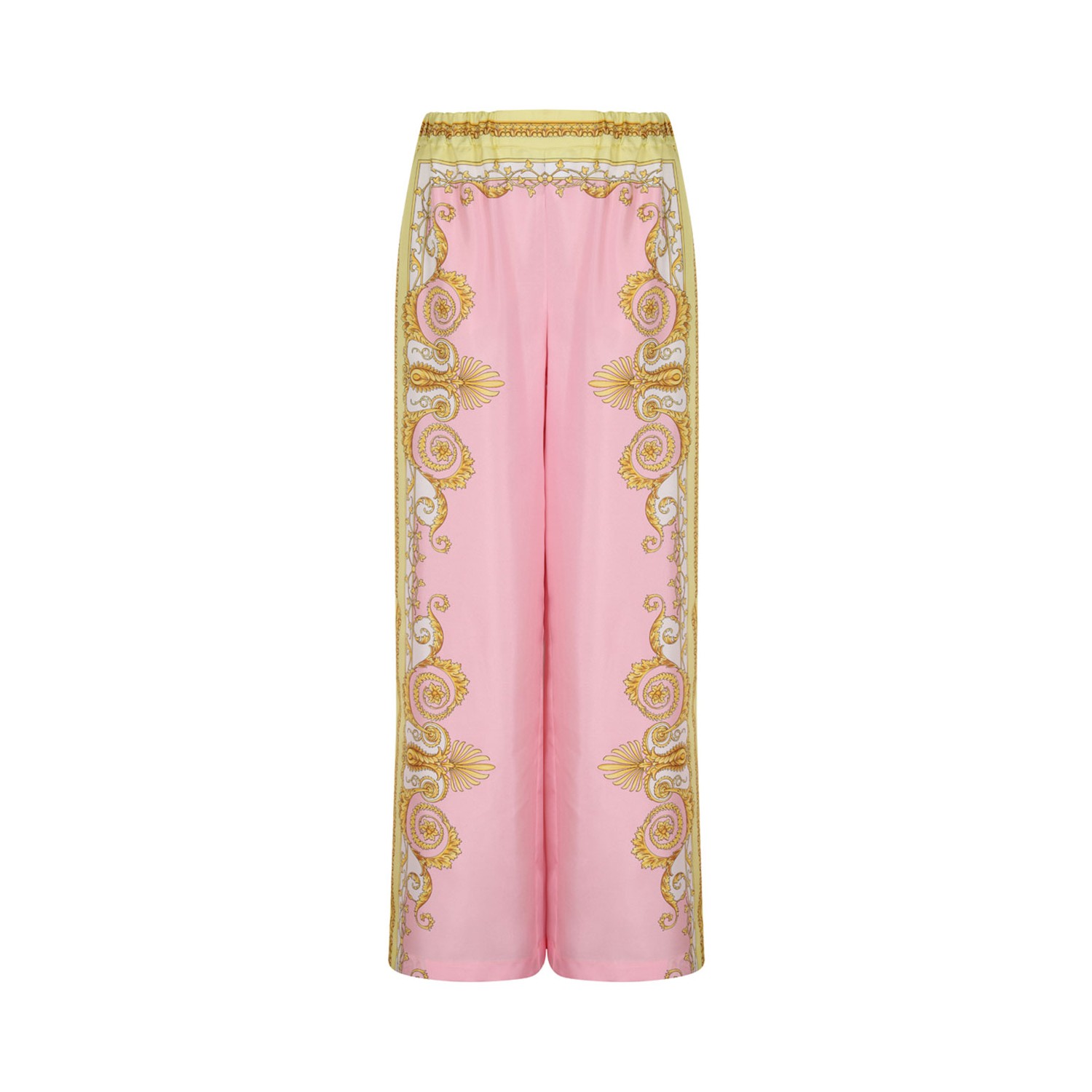 Versace Multicolour Baroque Underwater Silk Pants. Wide-leg silk twill pajama-style trousers featuring an Underwater Barocco print and a jacquard '90s Vintage Logo label on the elasticated waistband.