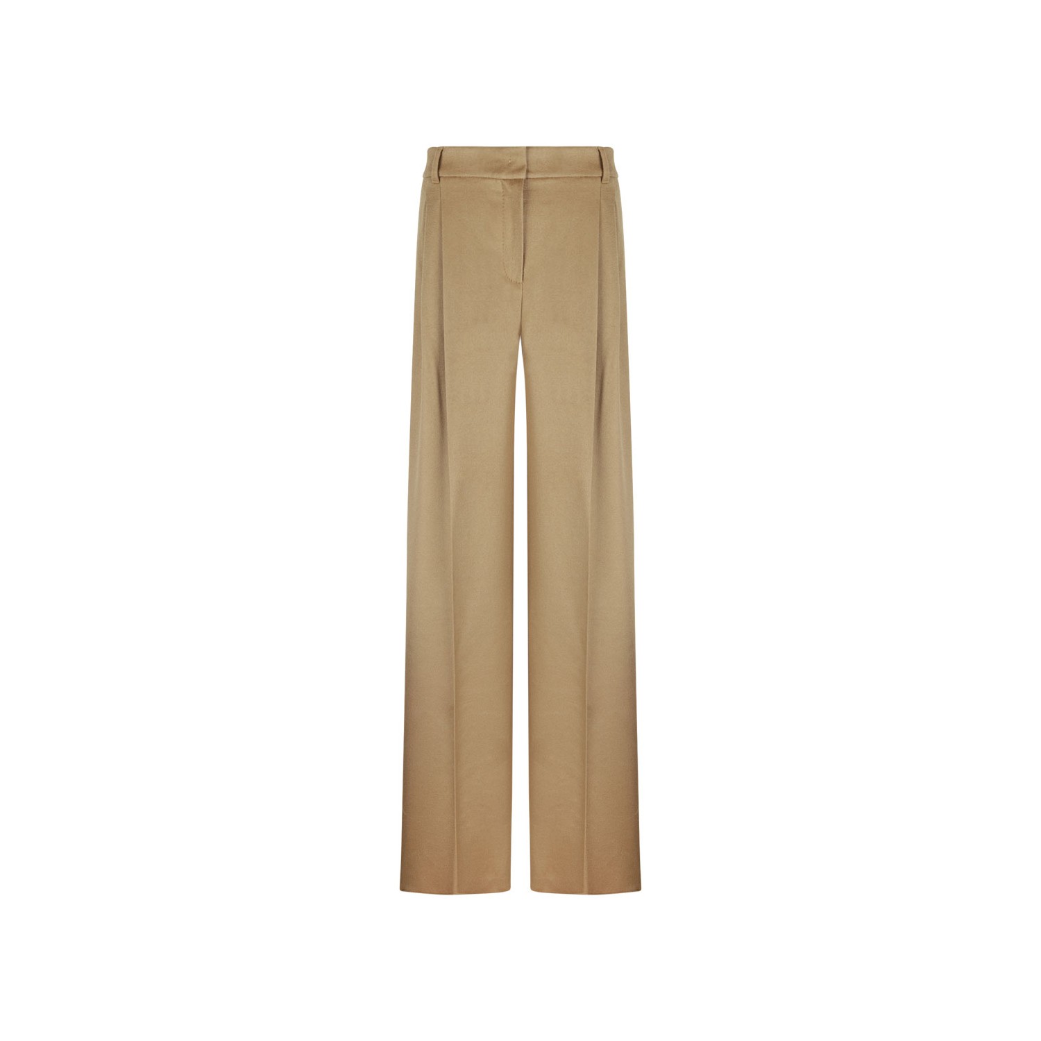 Max Mara Camel Flowing Trousers In Pure Wool. Camel pure wool drap trousers, loose fit and wide leg cut. Closure with high waistband, zip with flap and hook. French pockets on the hips, ironed crease, darts sewn into the waist at the back.