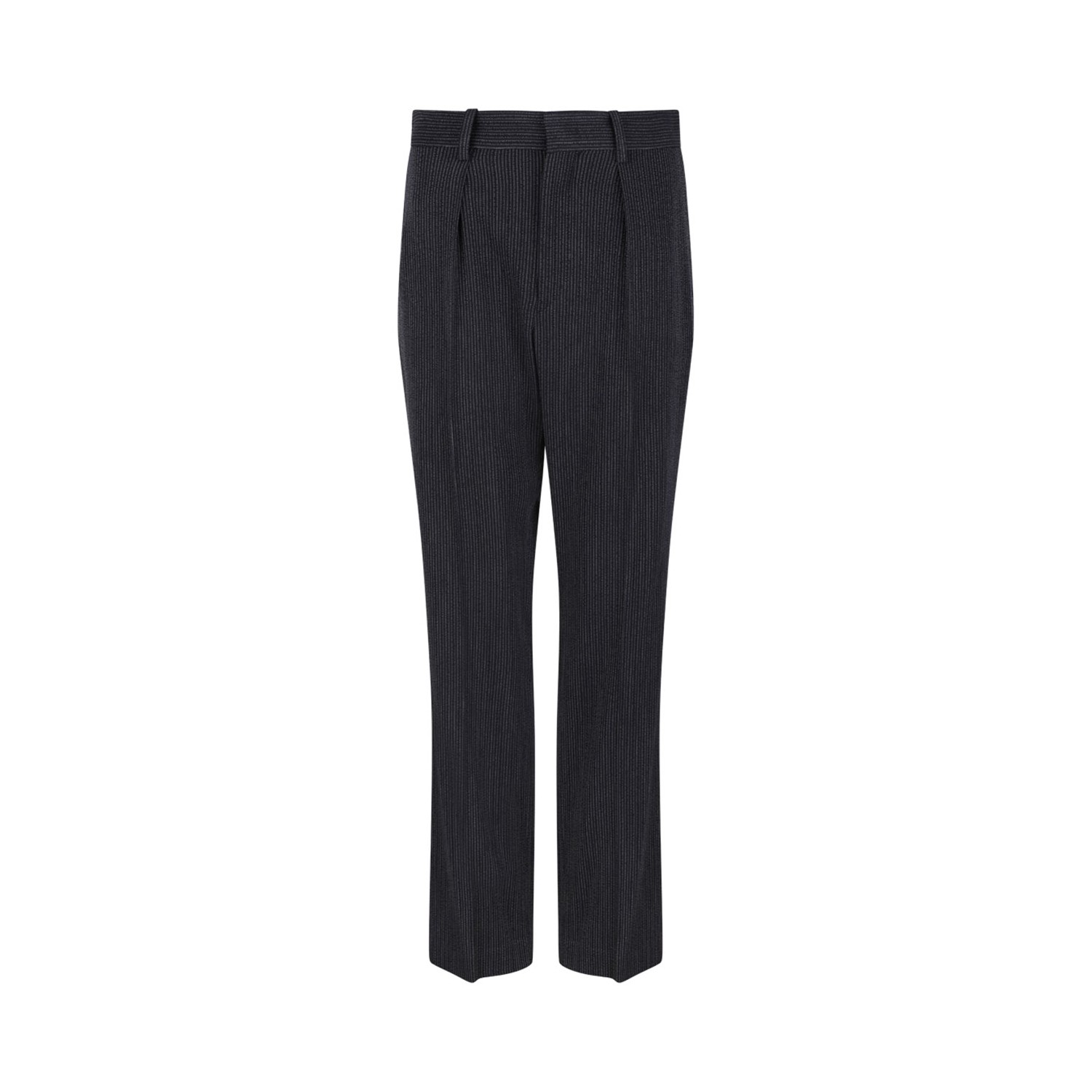 Isabel Marant Henda Black Pants. Black tailored trousers with pleats and white dotted stripes. Two side pockets and two buttoned pockets at the back. Zip fastening at the front with hook and loop fastener. Straight cut.
