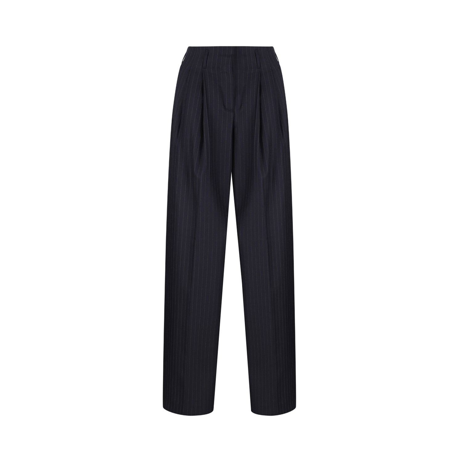 Golden Goose Navy Blue Pinstriped Trousers With Crease. Navy blue pinstripe pattern trousers with pleats on the front, pleats on the back hook and eye closure, button pocket.