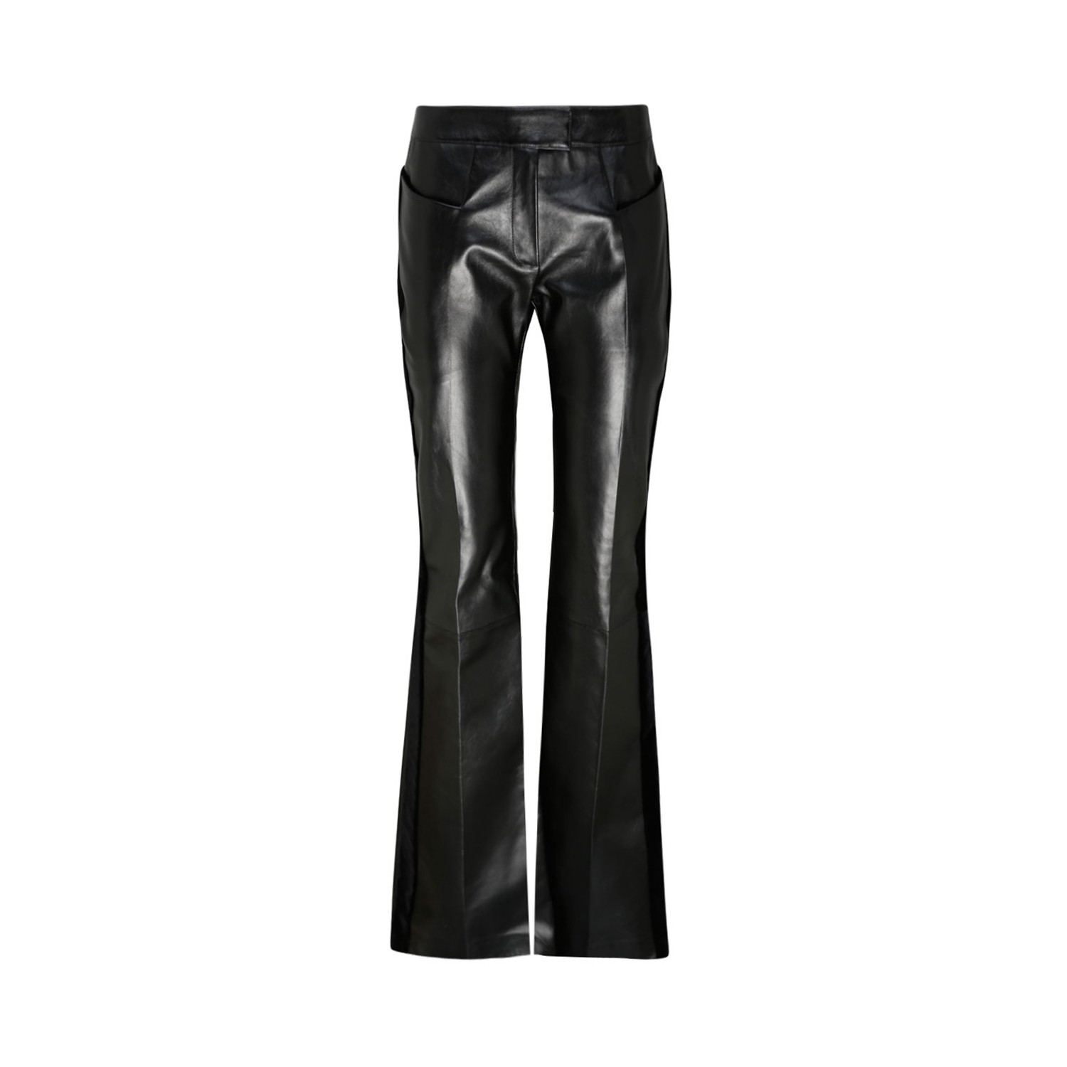 Tom Ford Black Calf Leather Flared Trousers. Black calf leather trousers, silk blend lining, concealed front fastening, two rounded pockets to the sides, two rear welt pockets, pressed crease and flared.