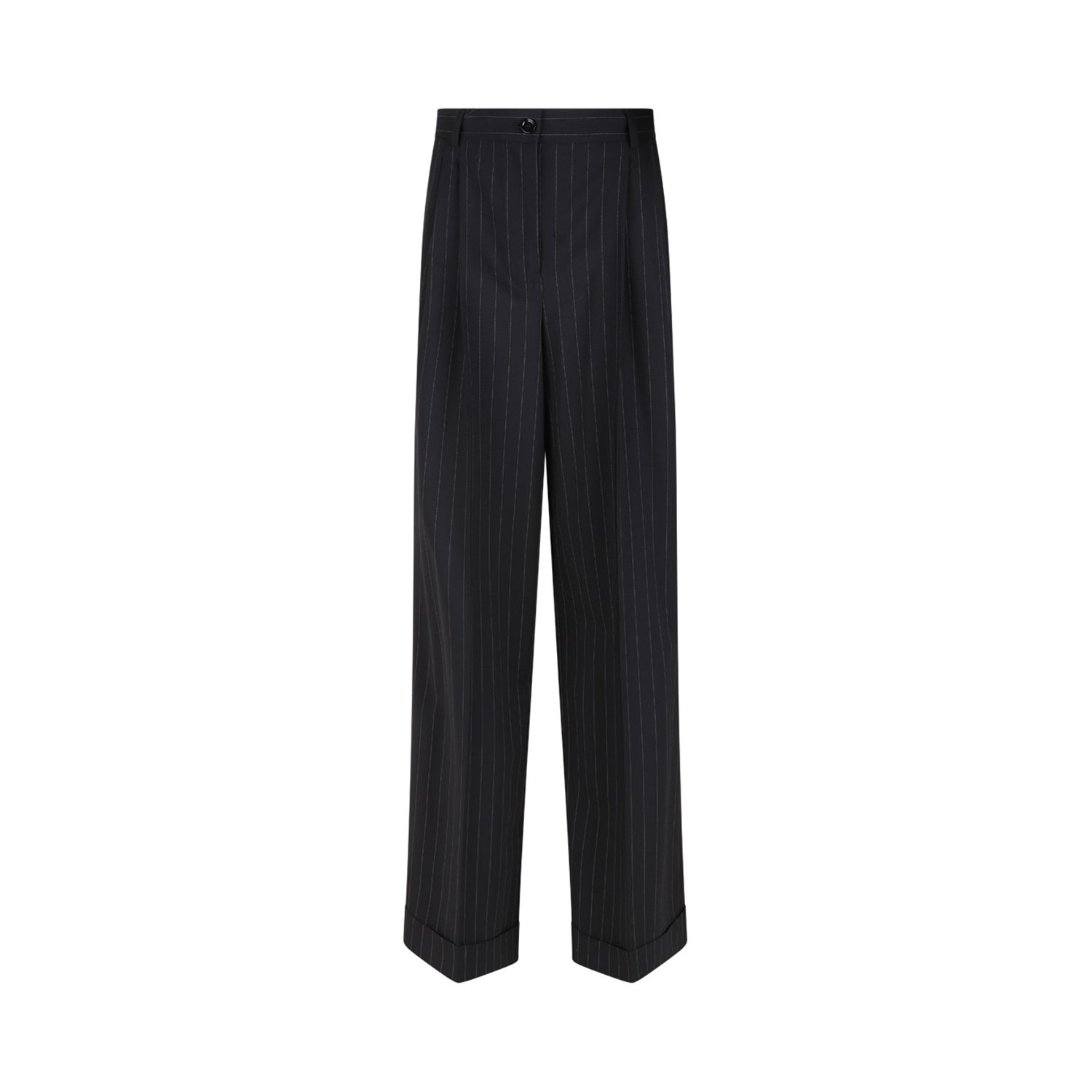 Dolce & Gabbana Flared Pinstripe Wool Pants. Black flared pinstripe stretch wool pants with Dolce high waist, front slant pockets. Welt back pockets, belt loops.