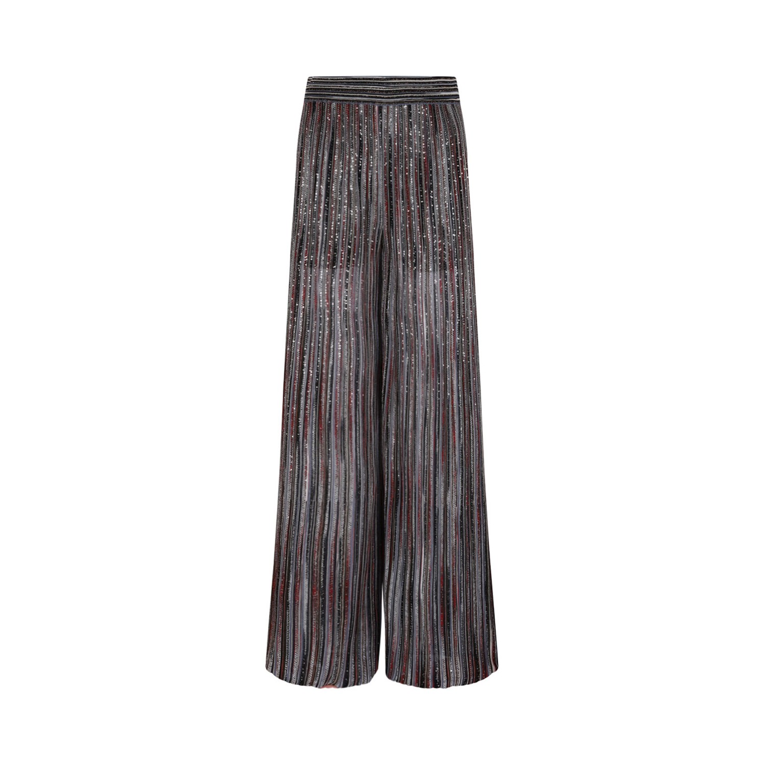 Missoni Multicolour Trousers With Sequins. Multicolour ribbed lame viscose blend trousers, embellished with sequins that reflect the light with refined naturalness. The wide leg adds fluidity and movement to the silhouette, a modern interpretation of the sophistication and timeless charm of Missoni style.