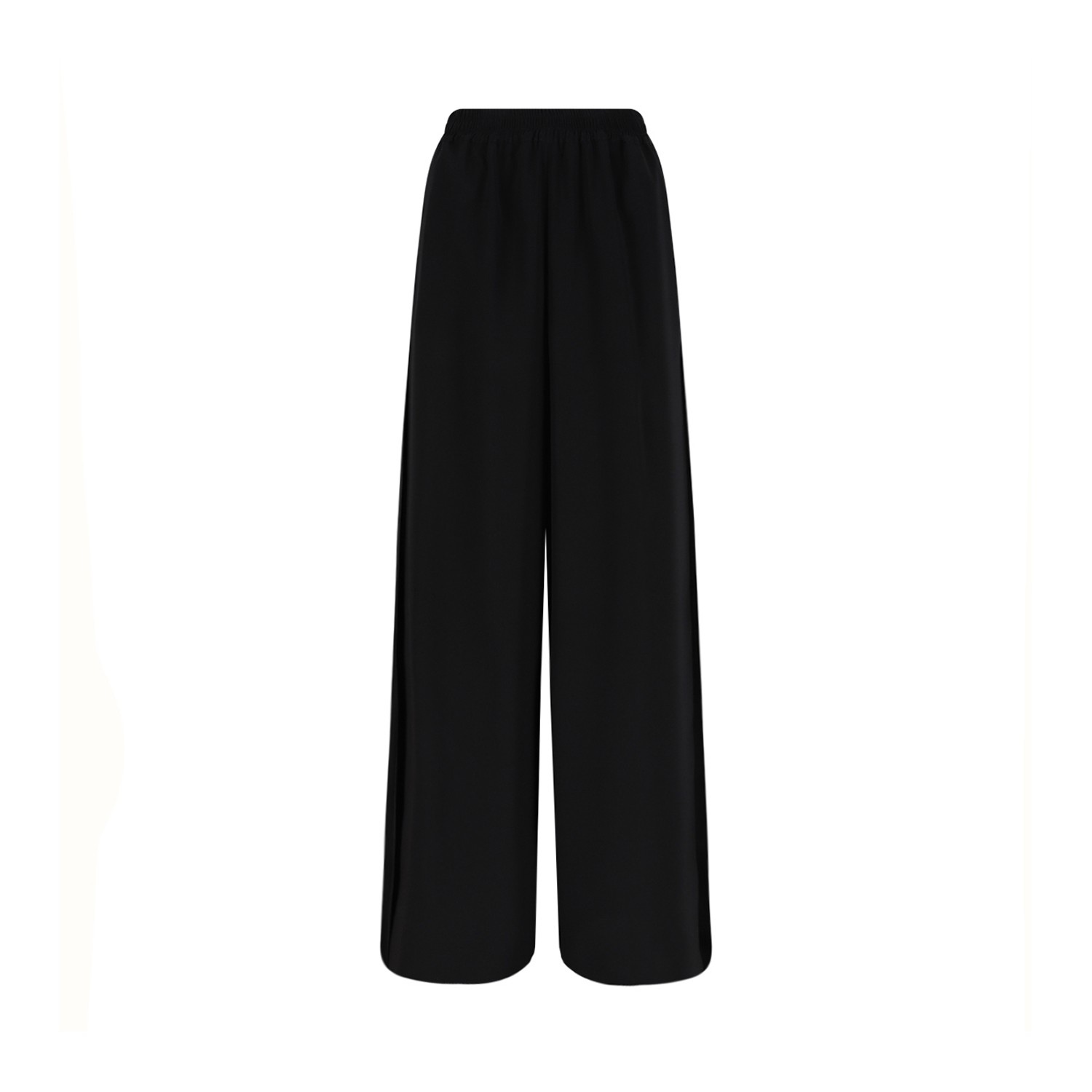 Max Mara Black Wide-Leg Fluid Trousers. Black wide-leg trousers defined by a fluid silhouette and effortless elegance. Crafted in a lightweight, softly draping fabric, these Max Mara pants feature a relaxed fit with a comfortable elasticated waistband that enhances ease and versatility. The wide-leg cut creates graceful movement with every step, while side pockets add functional refinement. Subtle side inserts enrich the design with a modern, flowing effect that elongates the figure. Made in Italy with meticulous craftsmanship, they combine comfort and sophistication. Perfect for elevated daywear or refined evening styling, these trousers embody the brand