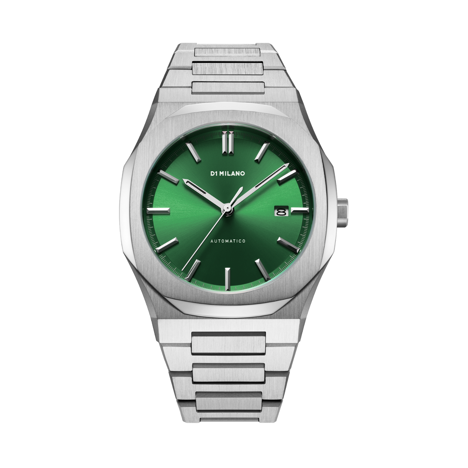D1 Milano Silver and Green New Automatic Watch. New Automatic finished with a slimmer case and a transparent case back, combining sunray finishes with a classic black dial.