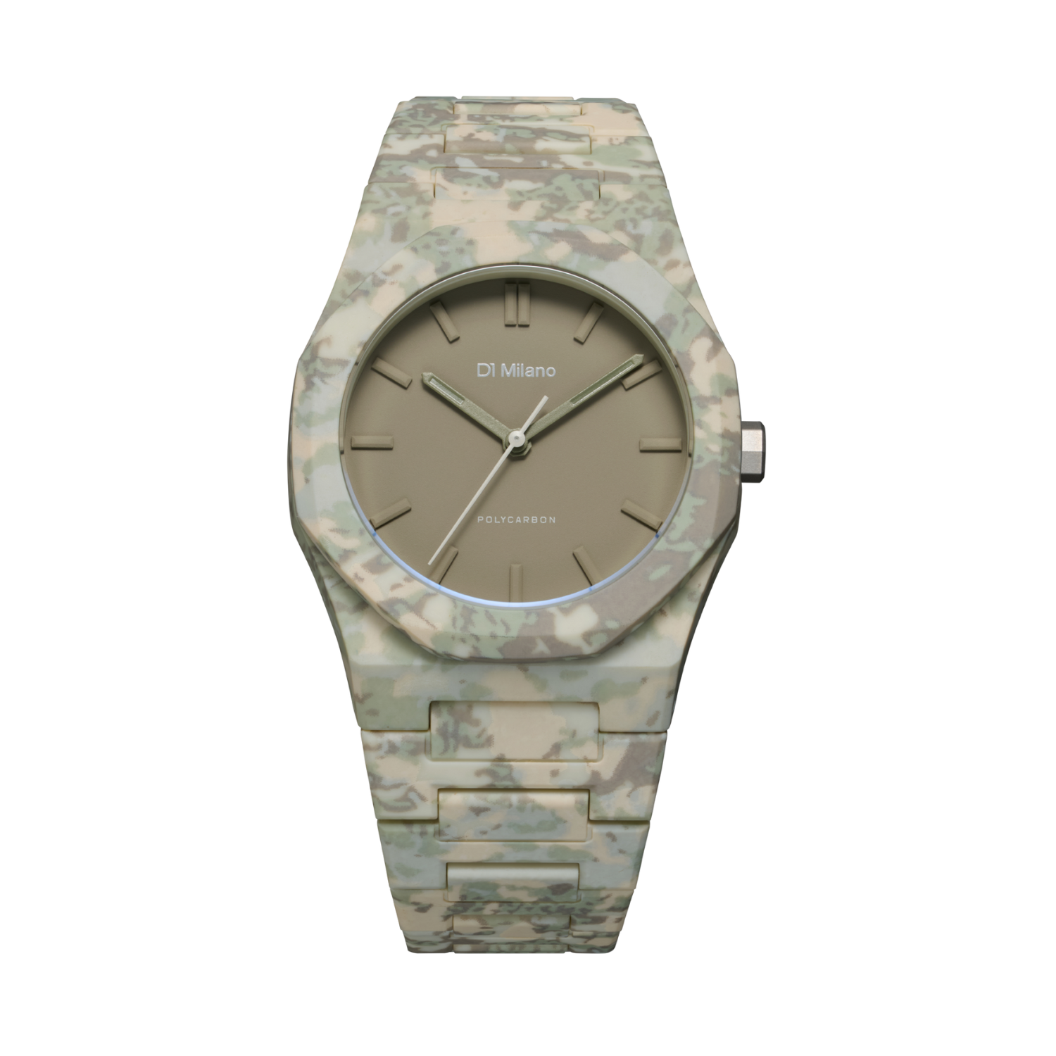 D1 Milano Forest Camo Modern Watch. The new Polycarbon Camo takes inspiration from the language of nature, with fractal surfaces and organic overlays that generate a modern and contemporary design.