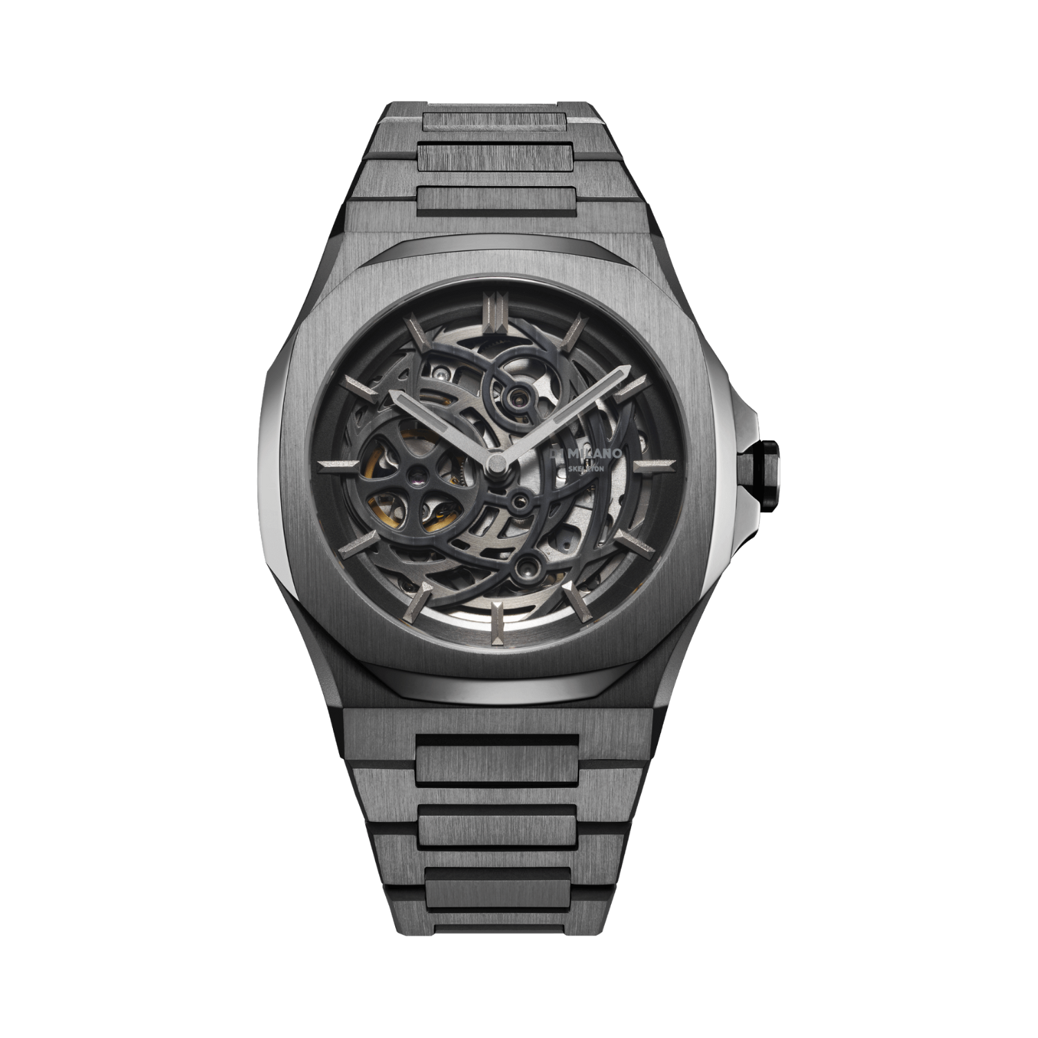 D1 Milano Dark Silver Mechanical Marvel Watch. Mechanical Marvel, reimagined for the bold and courageous. Featuring a new transparent skeleton dial, 24-jewel automatic movement, and dark silver-tone stainless steel accents.
