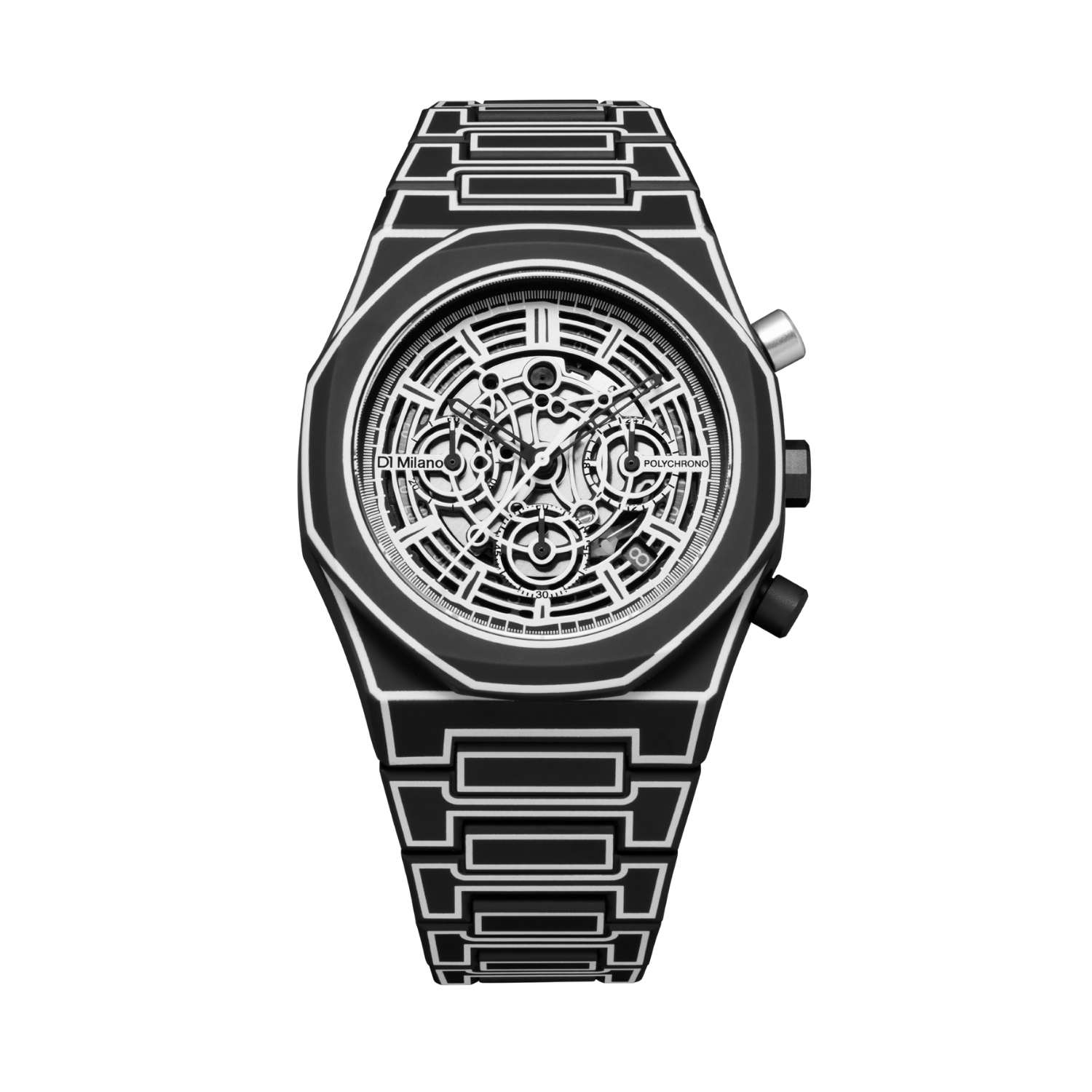 D1 Milano Black Sketch Watch. Crafted entirely from polycarbonate with a soft-touch white finish, the case, bezel, and integrated bracelet are adorned with subtle illustrations that trace the watch's very silhouette.