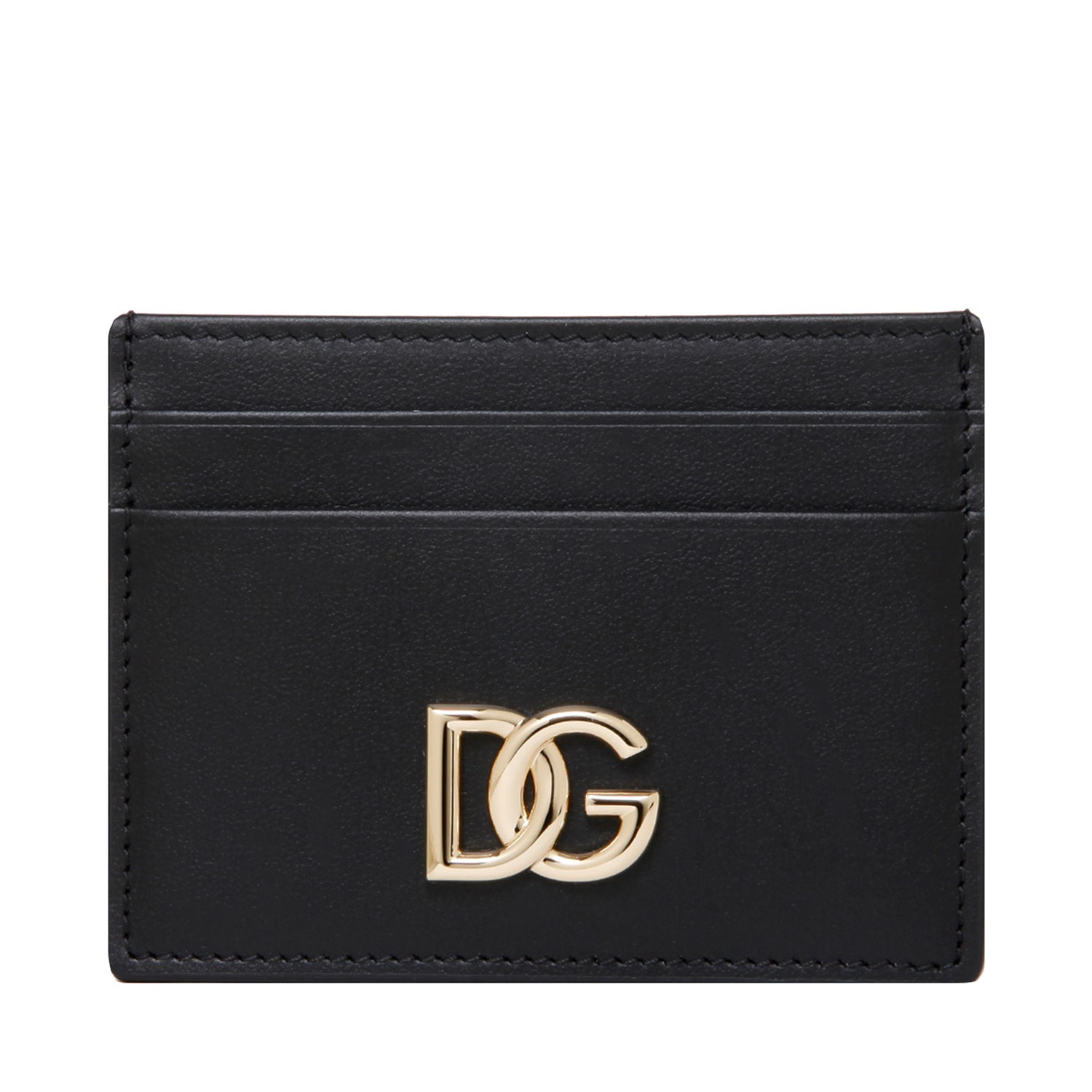 Dolce & Gabbana Black DG Logo Cardholder. Black calfskin cardholder with light gold plated DG logo, four card slots and one on top.