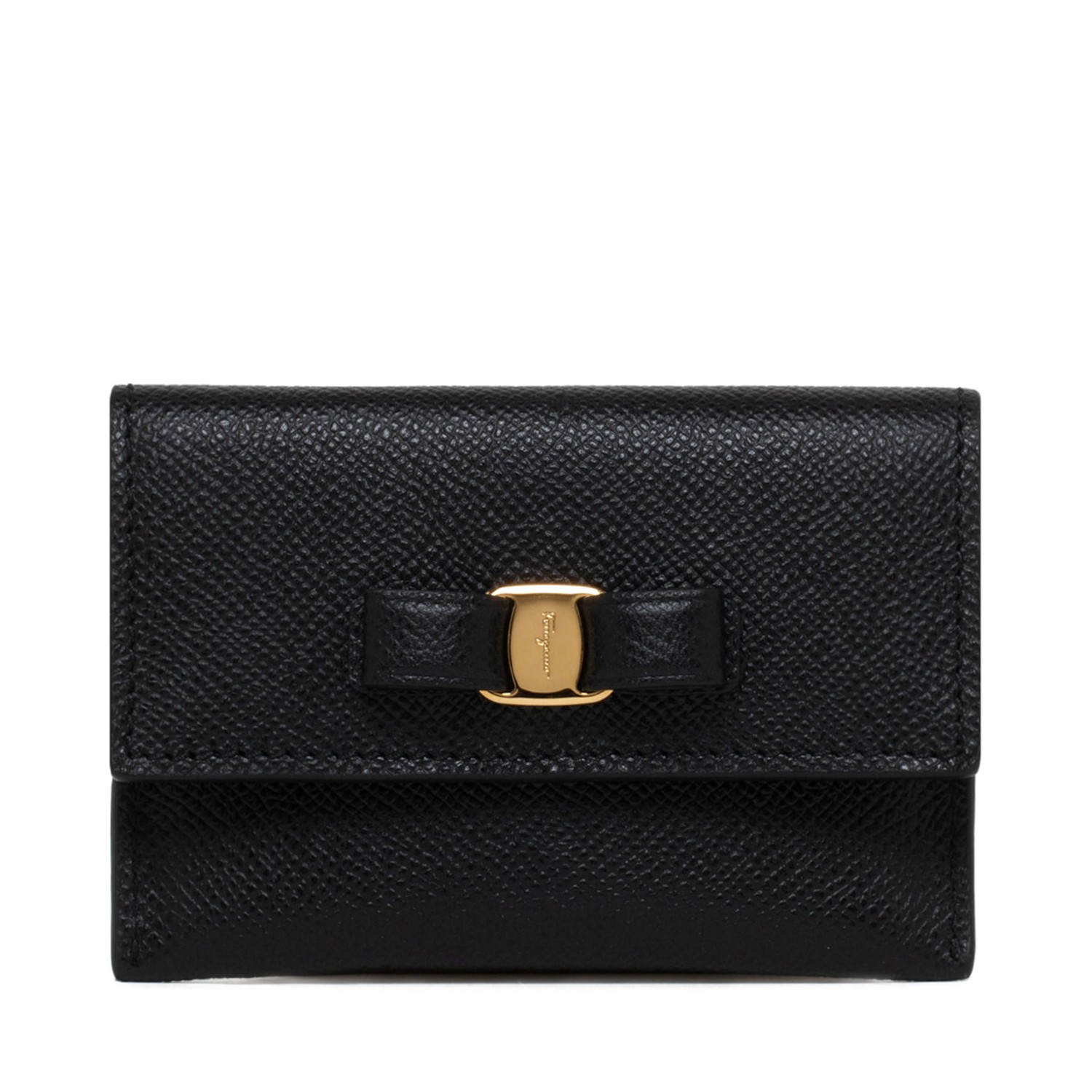 Ferragamo Black Leather Vara Bow Card Holder. Black leather card holder, flap with mini Vara bow on the front, gold tone detailing, snap button closure, two card slots on the inside and one flat pocket on the outside
