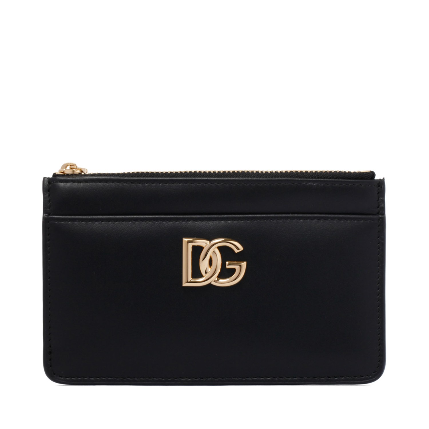 Dolce & Gabbana Black Cardholder. The zipped card holder is made of calfskin and personalized with a DG logo in light gold-plated metal. Practical and compact, it features a zipped gusseted compartment on top.