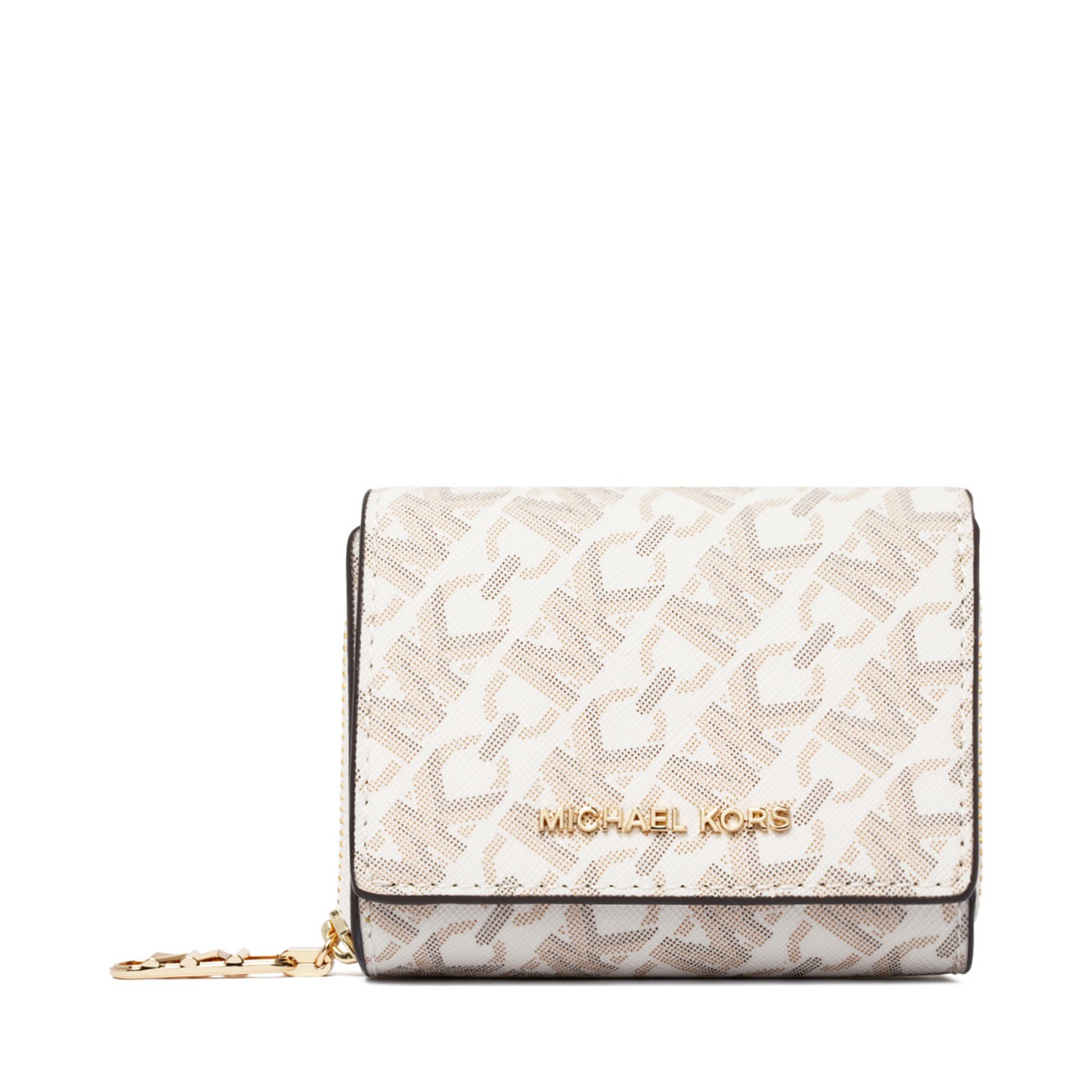 Michael Kors White Logo Print Wallet. White all over logo print wallet, logo plaque, gold-tone hardware, snap-fit fastening, coin pocket, card slots.