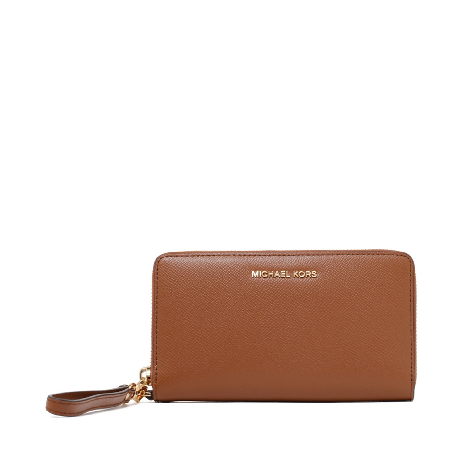 Michael Kors Brown Large Smartphone Wristlet. Brown cross grain leather smartphone wrist pouch, gold tone metal details, three sided zip closure, removable wrist strap, various credit card slots, document compartment.