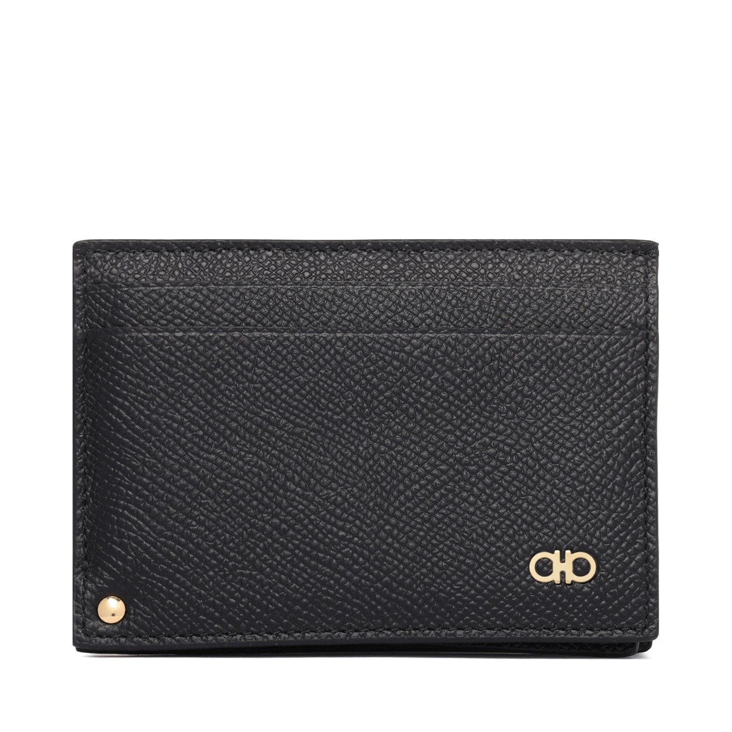 Ferragamo Black Gancini Card Holder. Black calf leather card holder, Gancini plaque, gold-tone hardware. Rectangle shape. card slots, sliding transparent ID slot.