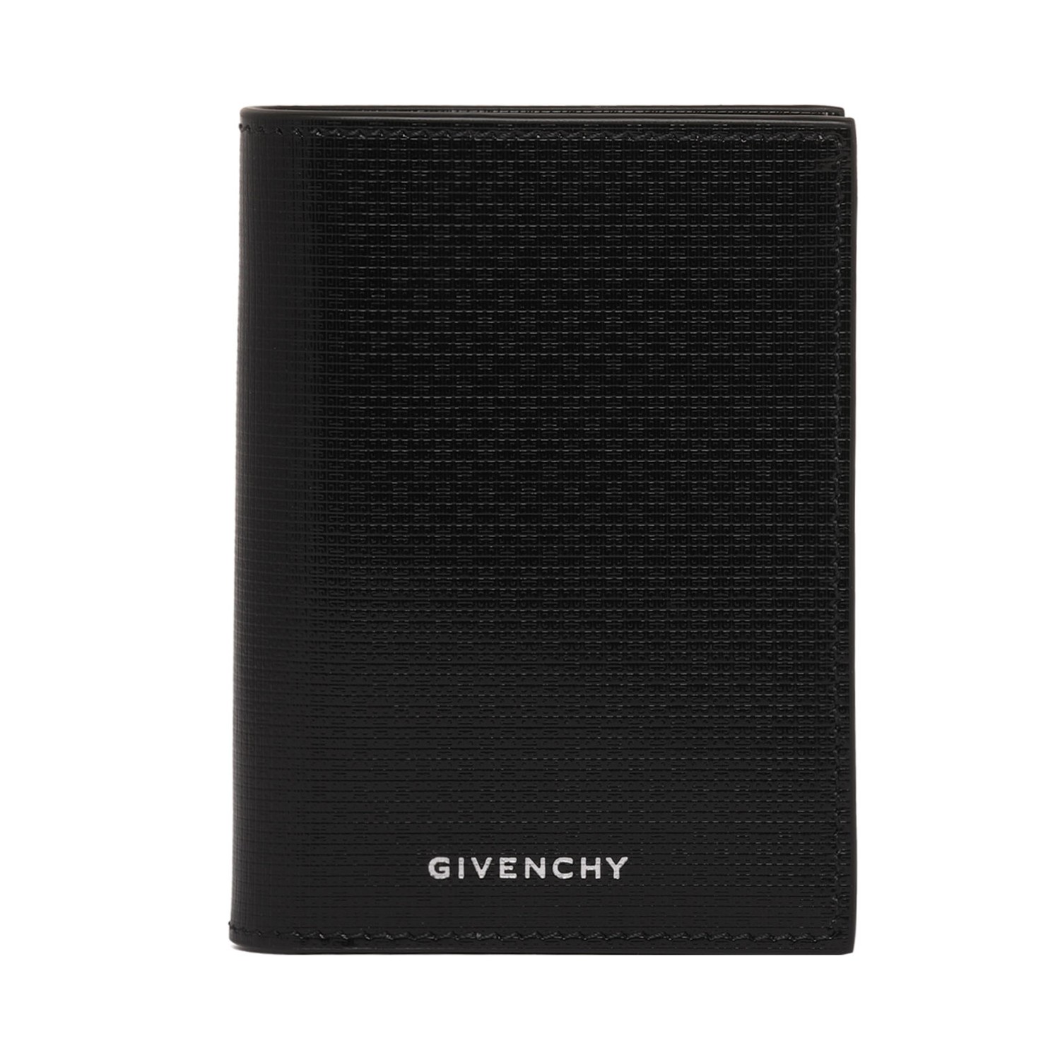Givenchy Black Leather Card Holder. Black leather card holder with all-over embossed small 4G motifs. Givenchy signature embossed on the outside, silver logo signature embossed inside. One compartment for banknotes and six card slots.