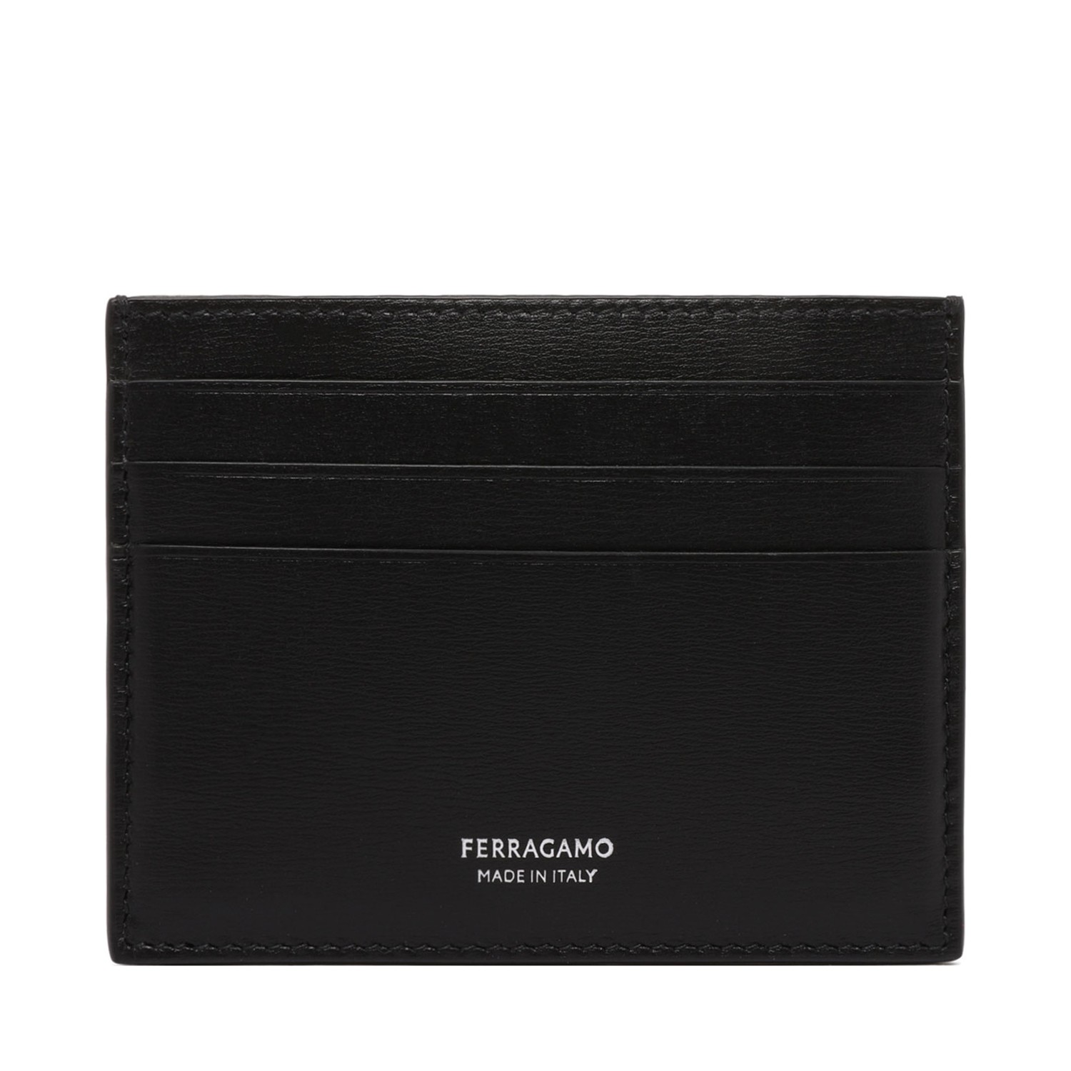 Ferragamo Black Credit Card Holder. An understated feel and functionality, in a cool version: this new card case in palmellato calfskin features card slots on both sides for outstanding capacity. Mini metallic logo on the front.