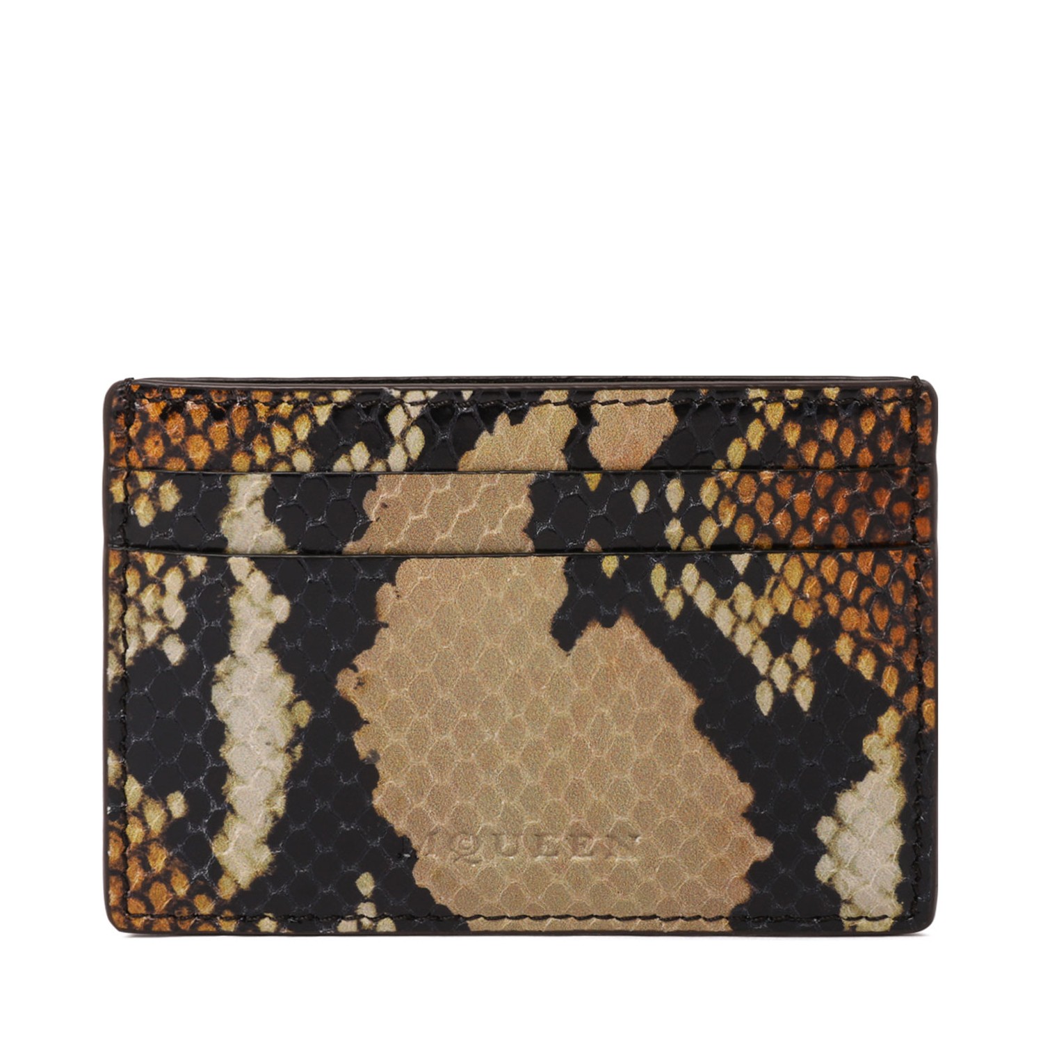 Alexander McQueen Brown and Gold Card Holder. The Card Holder crafted from brown calf leather with a python-effect print and featuring a central compartment and four card slots. Finished with a gold foil McQueen logo.
