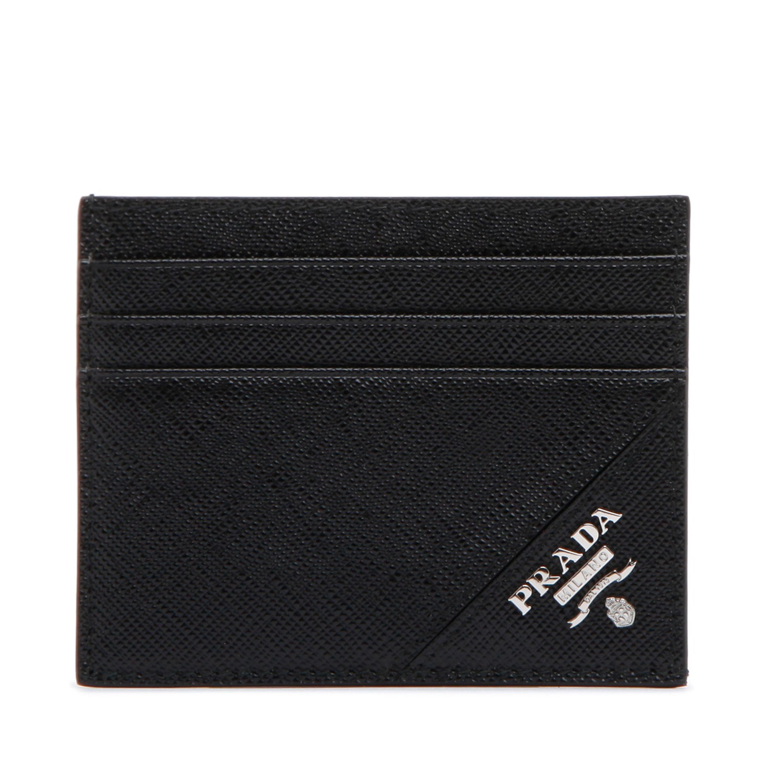 Prada Black Saffiano Leather Card Holder. Black Saffiano leather card holder with logo lettering, card slots, square body.