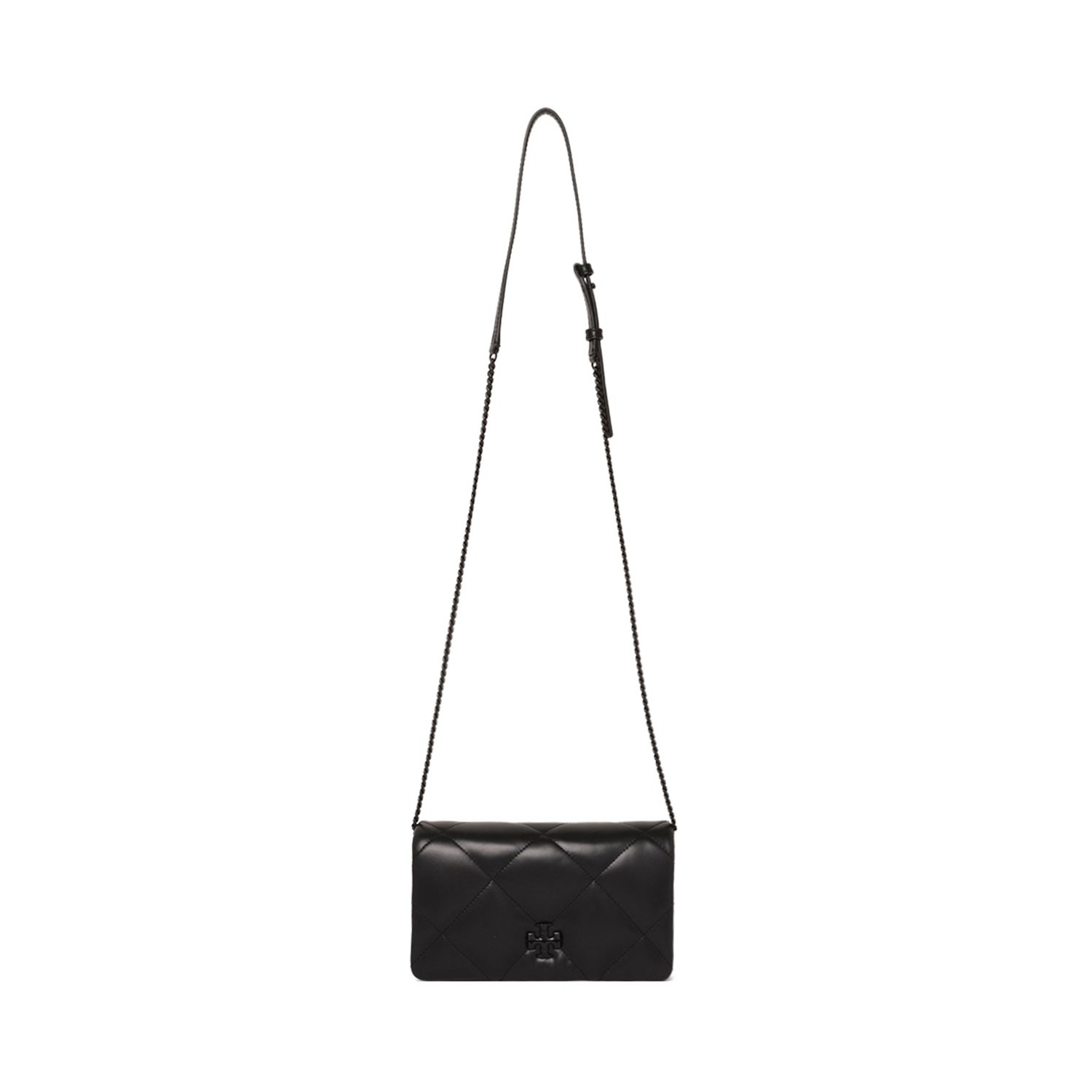 Tory Burch Black Kira Diamond Quilt Powder Coated Chain Wallet. Black wallet is an elegant and sophisticated piece, perfect for any occasion. Its flap design and chain add a distinctive touch, while the quilted finish brings a modern flair. Ideal for carrying your essentials in style, this wallet is a must-have accessory for those seeking a touch of luxury in their everyday life.
