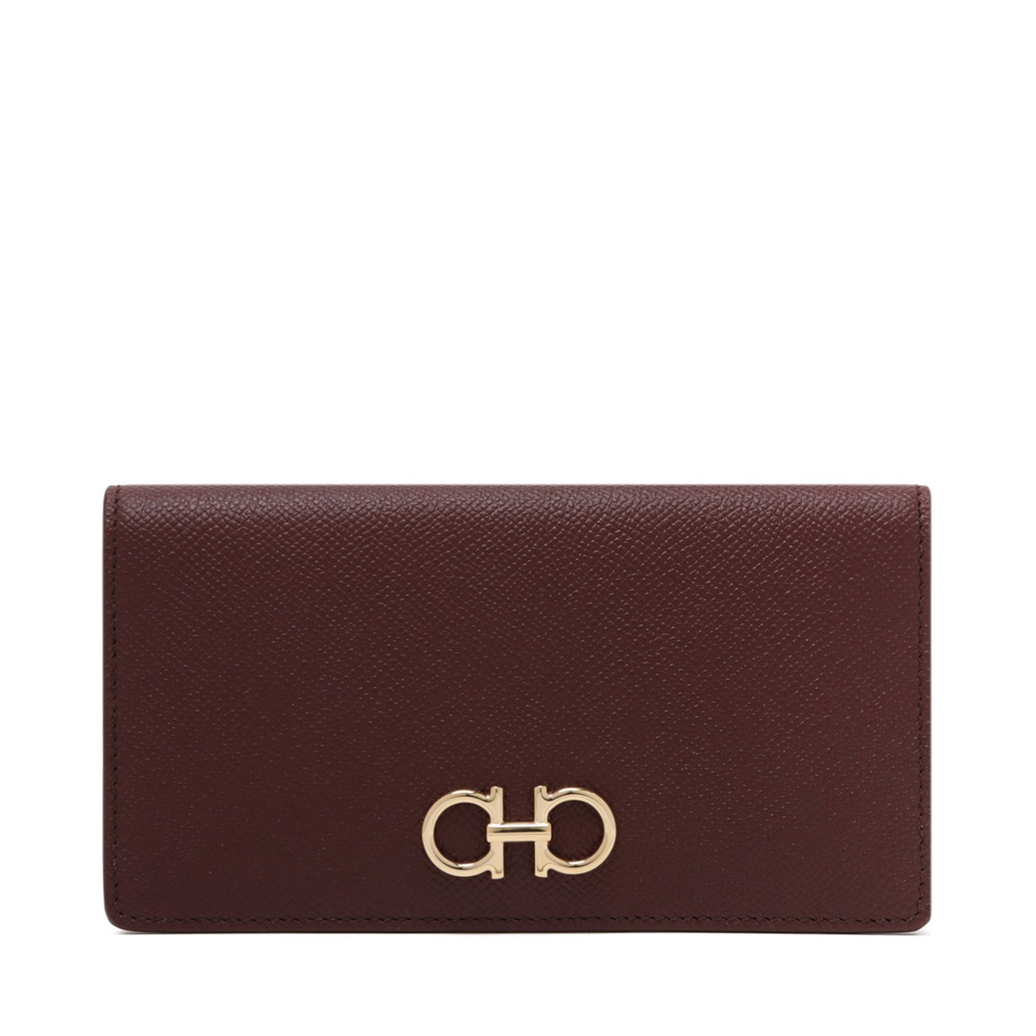 Ferragamo Plum Gancini Continental Wallet. Plum large continental wallet, adorned with a gold-tone Gancini buckle. The spacious interior boasts multiple compartments, plus a zipped coin pocket at the rear, to help you organize bills, credit cards, and documents.