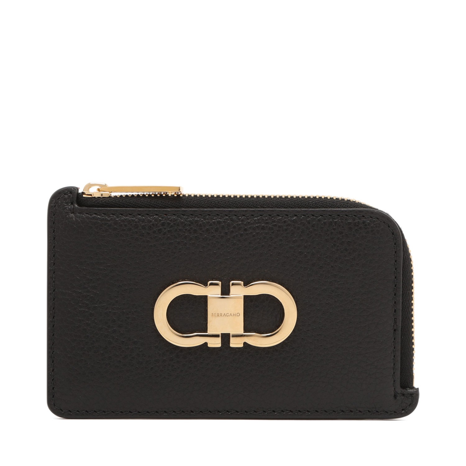 Ferragamo Black Credit Card Holder With Coin Purse. Black Compact credit card holder cut from luxurious hammered calfskin leather. Pierced by a golden Gancio on the front, practical details include a coin compartment with wrap around zip, and credit card slots at the back.