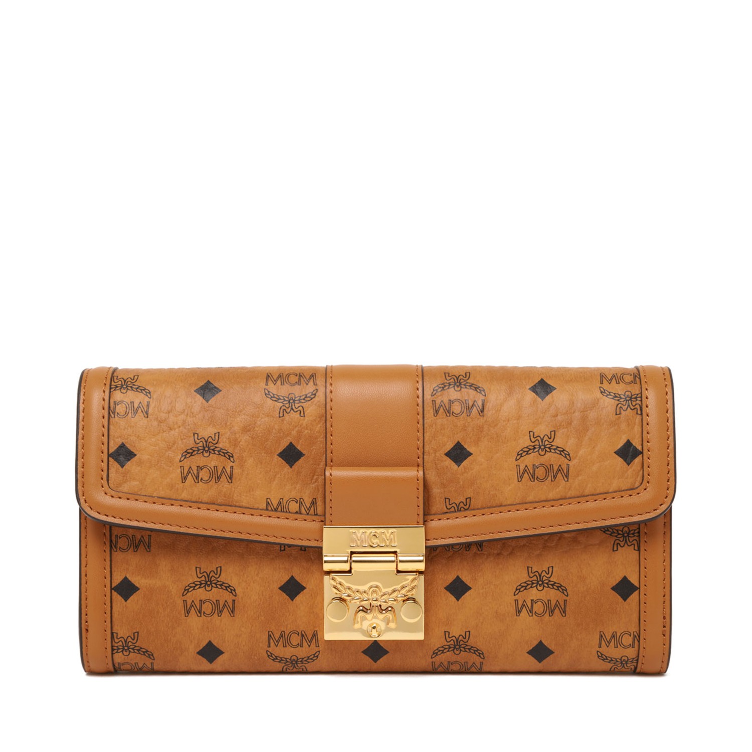 MCM Cognac Tracy Wallet. Cognac wallet with monogram print, flap at the top, snap closure, chain link and gold-colored details.