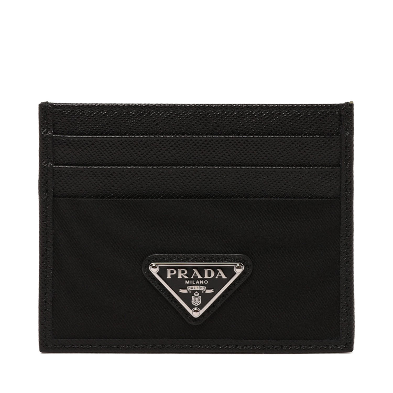 Prada Black Card Holder In Re-Nylon And Saffiano. Black cap decorated with the iconic enameled metal triangle logo, this baseball cap is made from Re-Nylon, a regenerated nylon yarn made from recycled and purified plastic collected from oceans, fishing nets, and textile fibers.