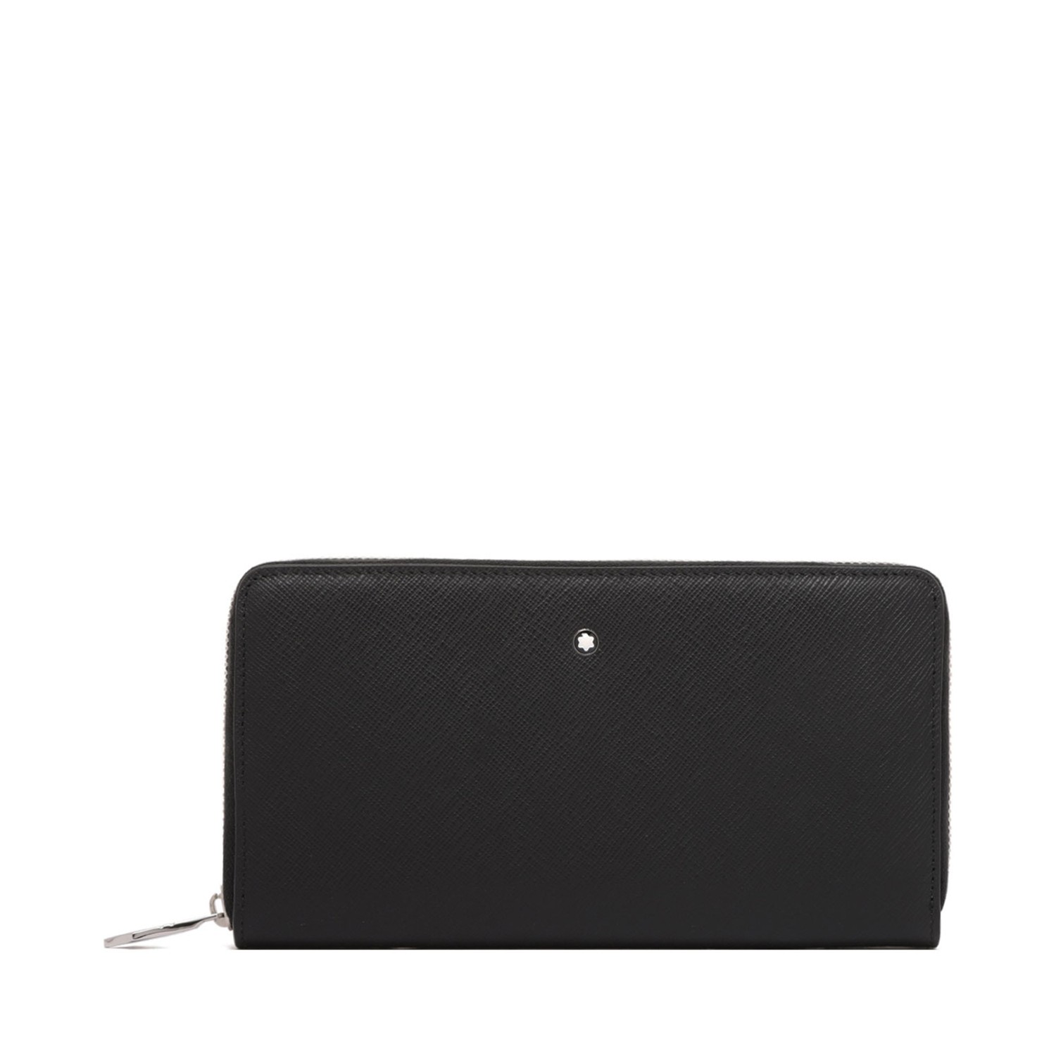 Montblanc Black Sartorial 12 Compartment Zipper Wallet. Crafted from classic black embossed Sartorial leather, this wallet combines functionality with refined design. The distinctive nib-shaped zipper pull pays homage to Montblanc's writing tradition. Inside, the wallet offers slots for up to 12 credit cards, three compartments for banknotes, a secure zipped coin case, and three additional pockets for smaller personal items.