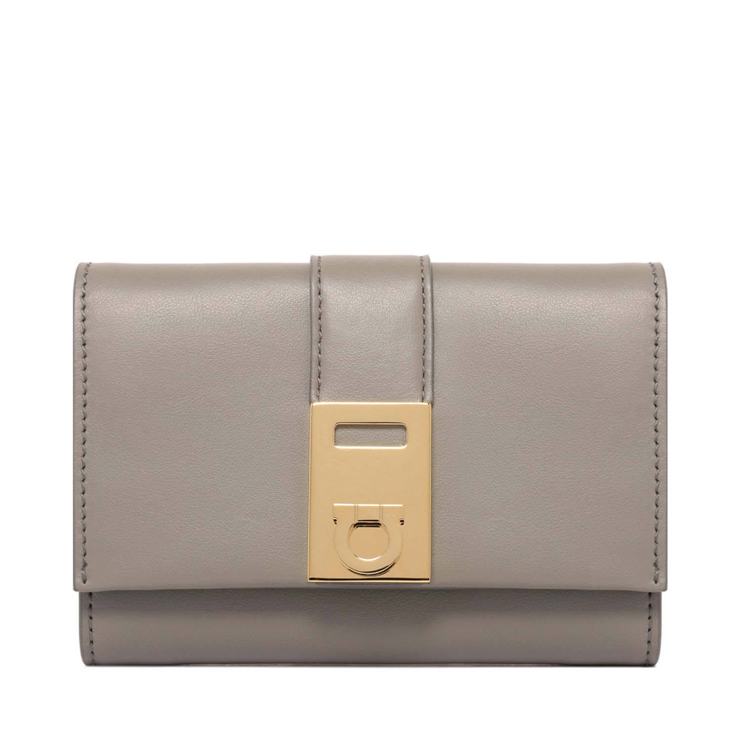 Ferragamo Ash Grey Hug Compact Wallet. Compact enough to fit into any handbag, the wallet from the Hug collection reveals all its refined elegance in its essential lines, Gancini closure and functional construction. Roomy enough to hold everything you need, it features an interior with a compartment for banknotes, slots, flat pockets and a hidden zip pocket along the edge for coins.