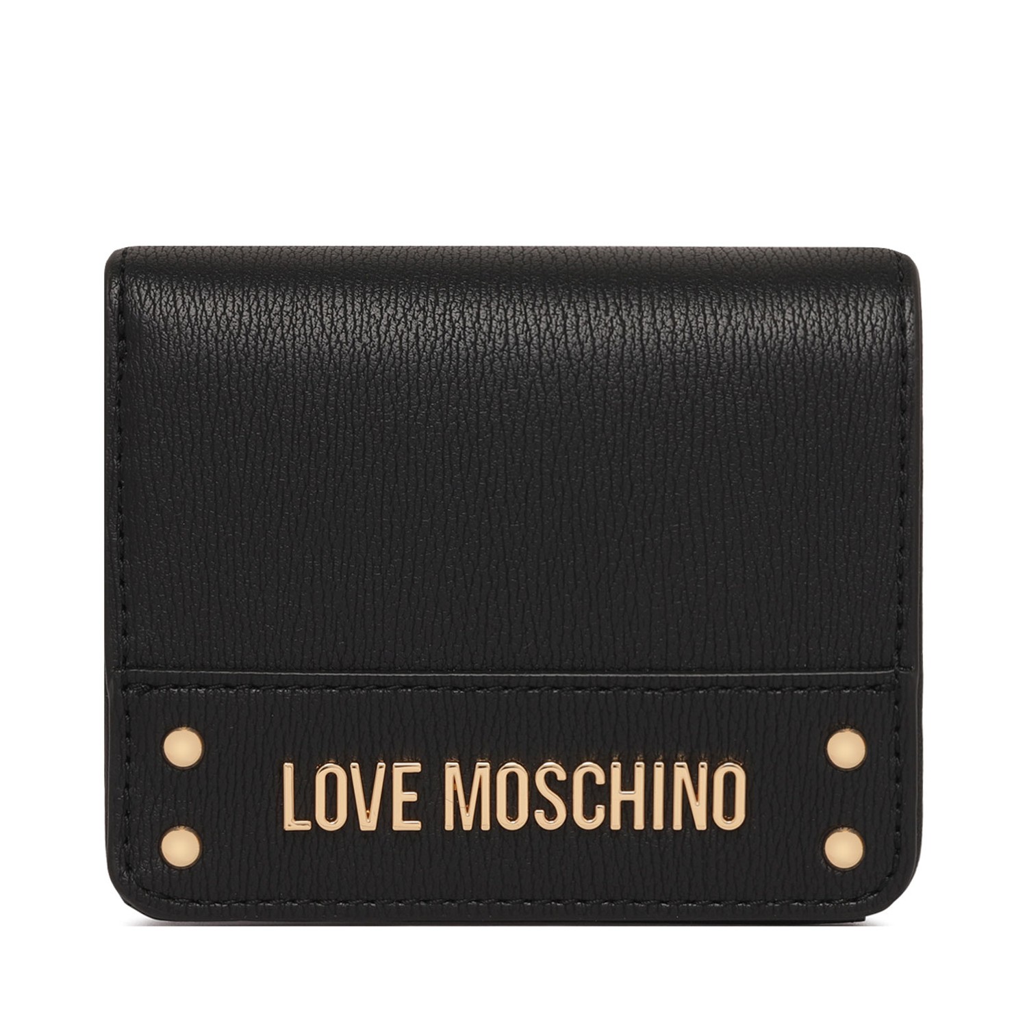 Love Moschino Black Logo Lettering Wallet. Black logo lettering wallet with bi-fold design, internal card slots, stud detail.